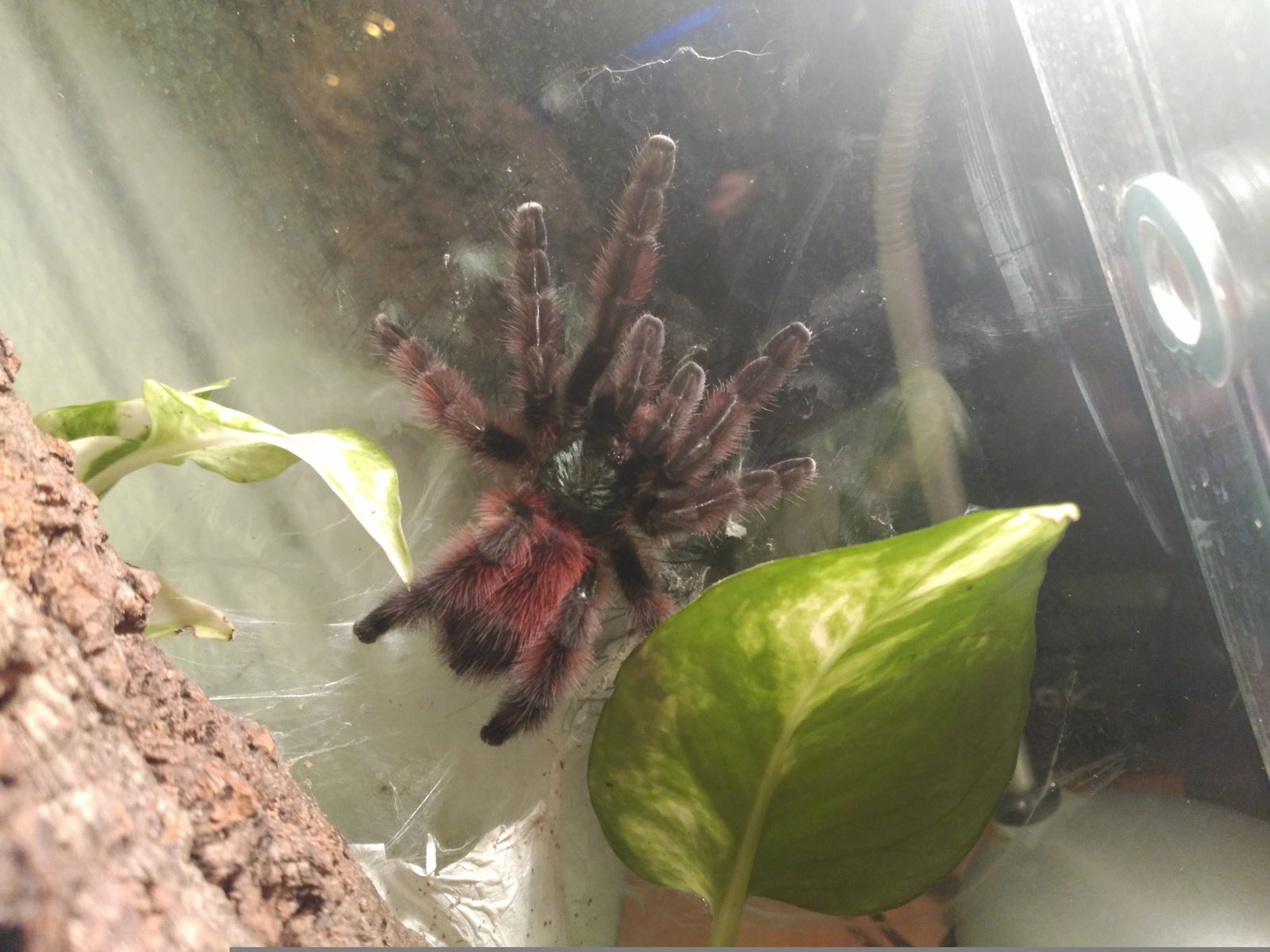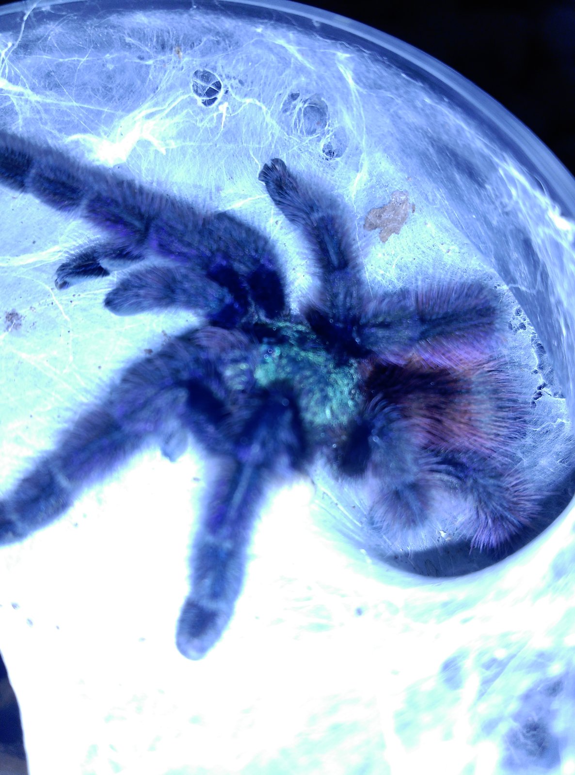 Avicularia versicolor(semiadulta) de 2 años y medio de edad, sobre unos 8 cm de legspam. Preciosa, de color verde azulado y púrpura.