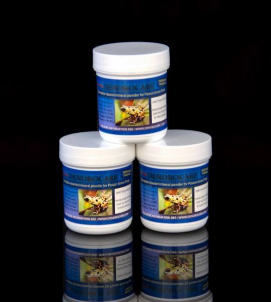 O Dendrocare é um suplemento All-In-One (Vitaminas+Cálcio) e foi desenvolvido tendo em conta os requisitos específicos das rãs da família Dendrobatidae. É apresentado em frascos de 100gr, de forma a manter as suas características durante a sua vida útil, o que permiti evitar a deterioração dos seus componentes. De acordo com criadores experientes este suplemento tem uma validade efectiva de 1 ano após abertura.