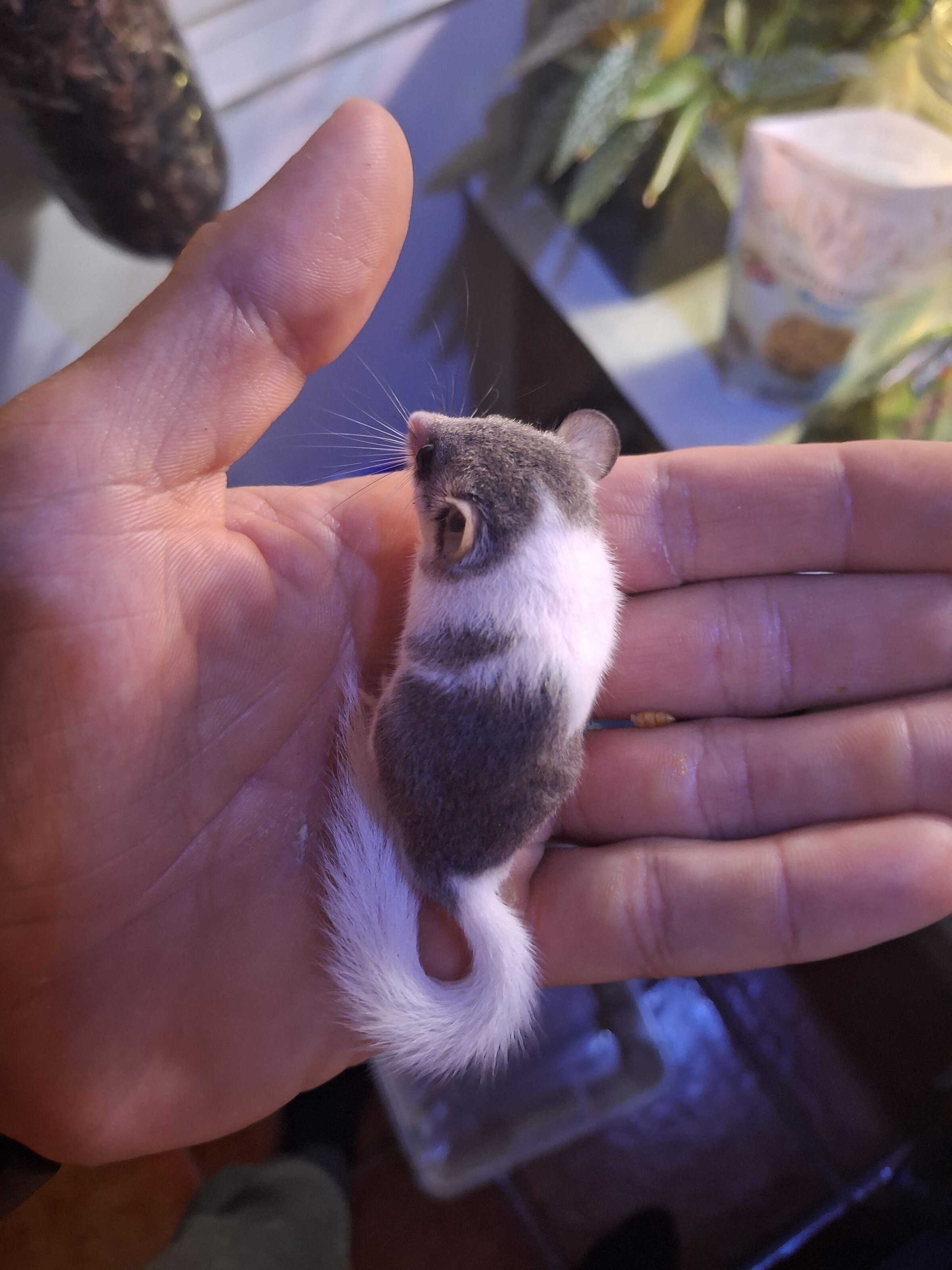 El lirón pigmeo africano (Graphiurus murinus), variedad pied es un pequeño roedor nocturno, muy ágil y curioso, caracterizado por presentar manchas blancas y grises que varían en forma y tamaño según el ejemplar. Necesita un espacio amplio con muchas ramas para trepar, además de refugios y una dieta variada basada en pienso, insectos, fruta y semillas.
