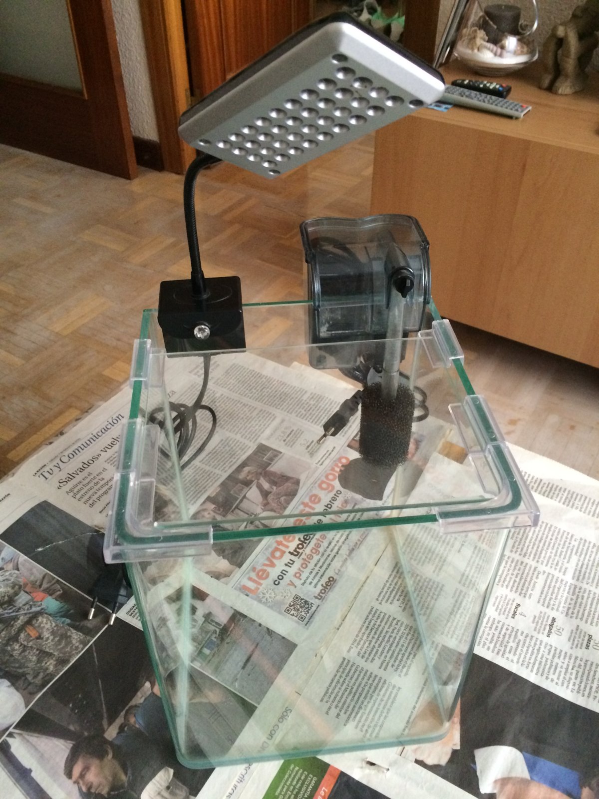 Vendo nano-acuario de 10 litros (20X20X25) con tapa, luz led y filtro de mochila. El precio es de 30€.
