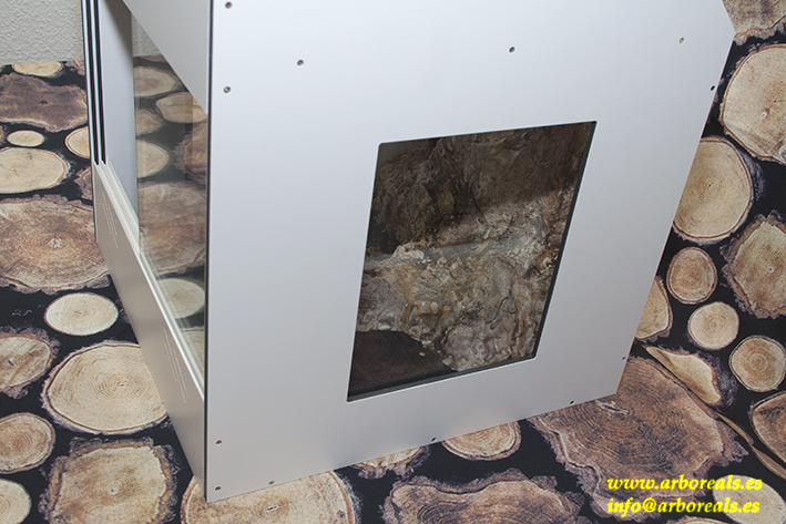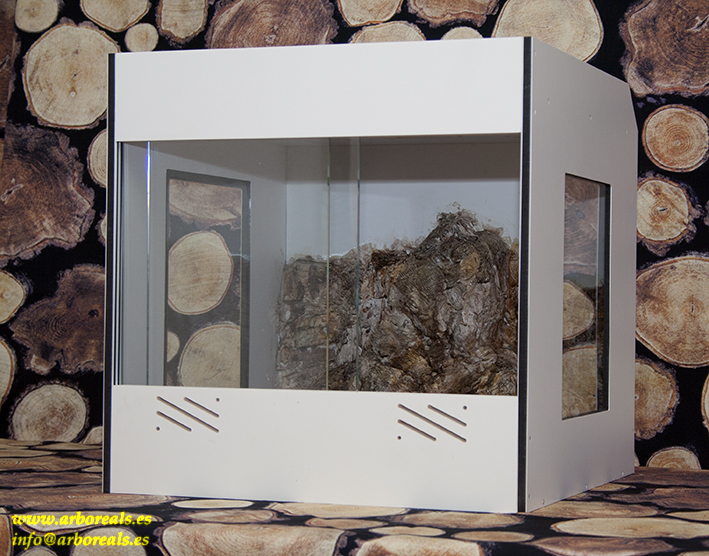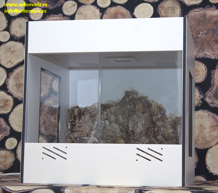 ... se vende terrario de PVC de la marca "Arboreals" medidas 45x45x45 con fondo decorado, ventana laterales, lud led integrada en techo y sin estrenar...
