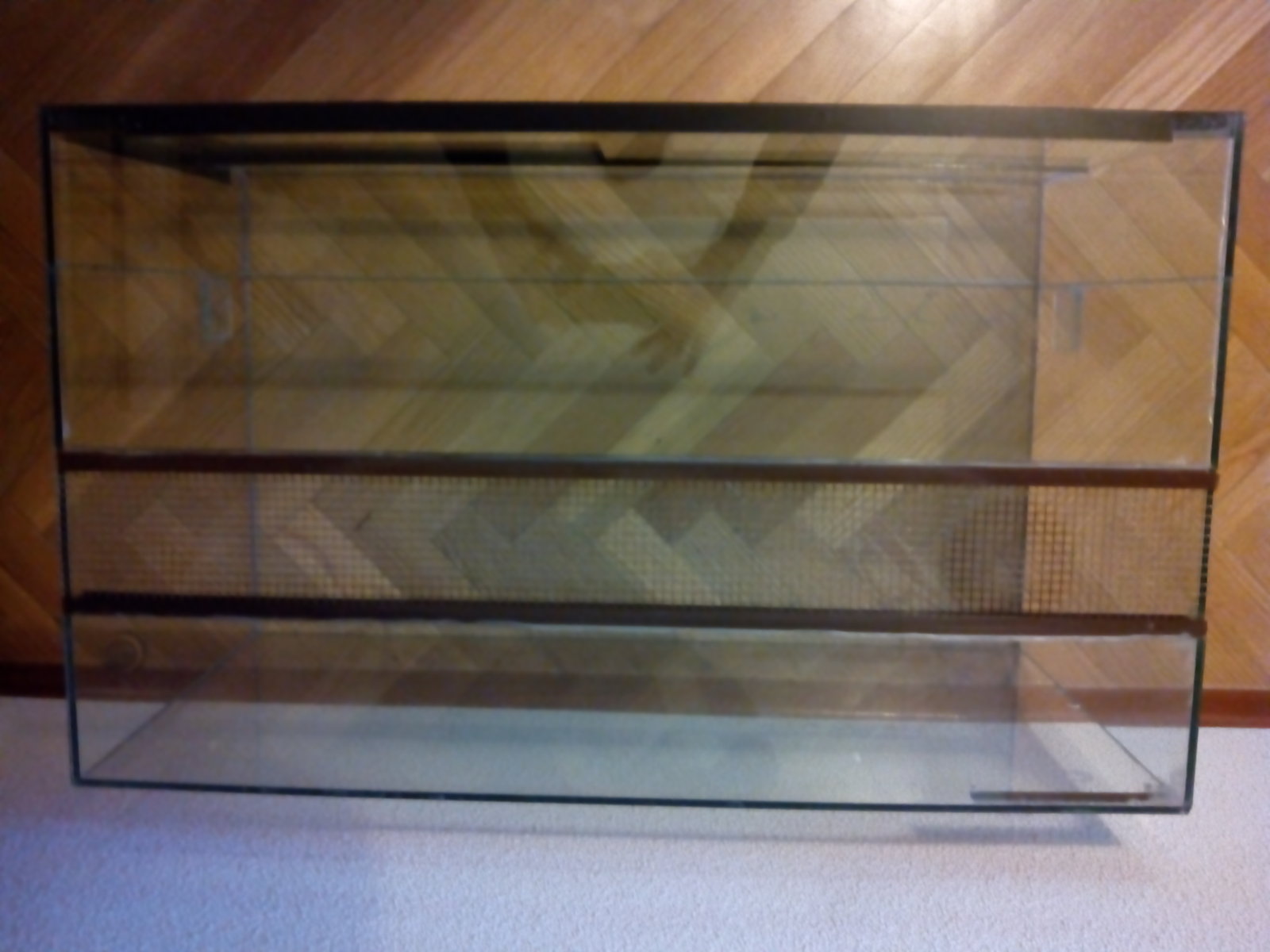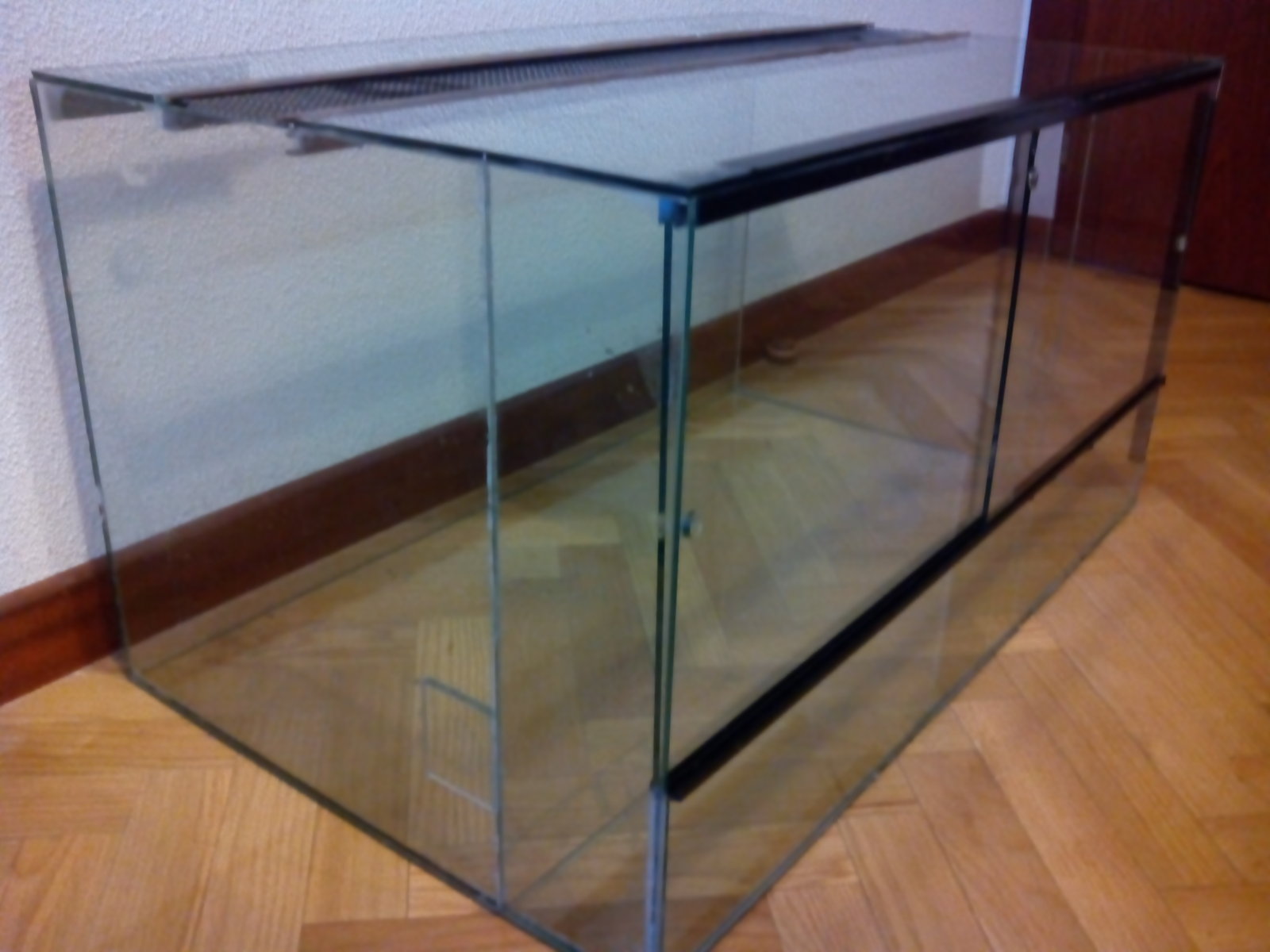 Vendo terrario de cristal artesanal en buen estado. Medidas: 74cms largo x 44, 5 cms fondo x 40 cms alto. Tiene algunos pequeños defectos estéticos pero está en perfecto estado de uso. Puertas correderas. Rejilla superior para ventilación. No me interesan cambios. Para recoger en zona Majadahonda / El Plantío