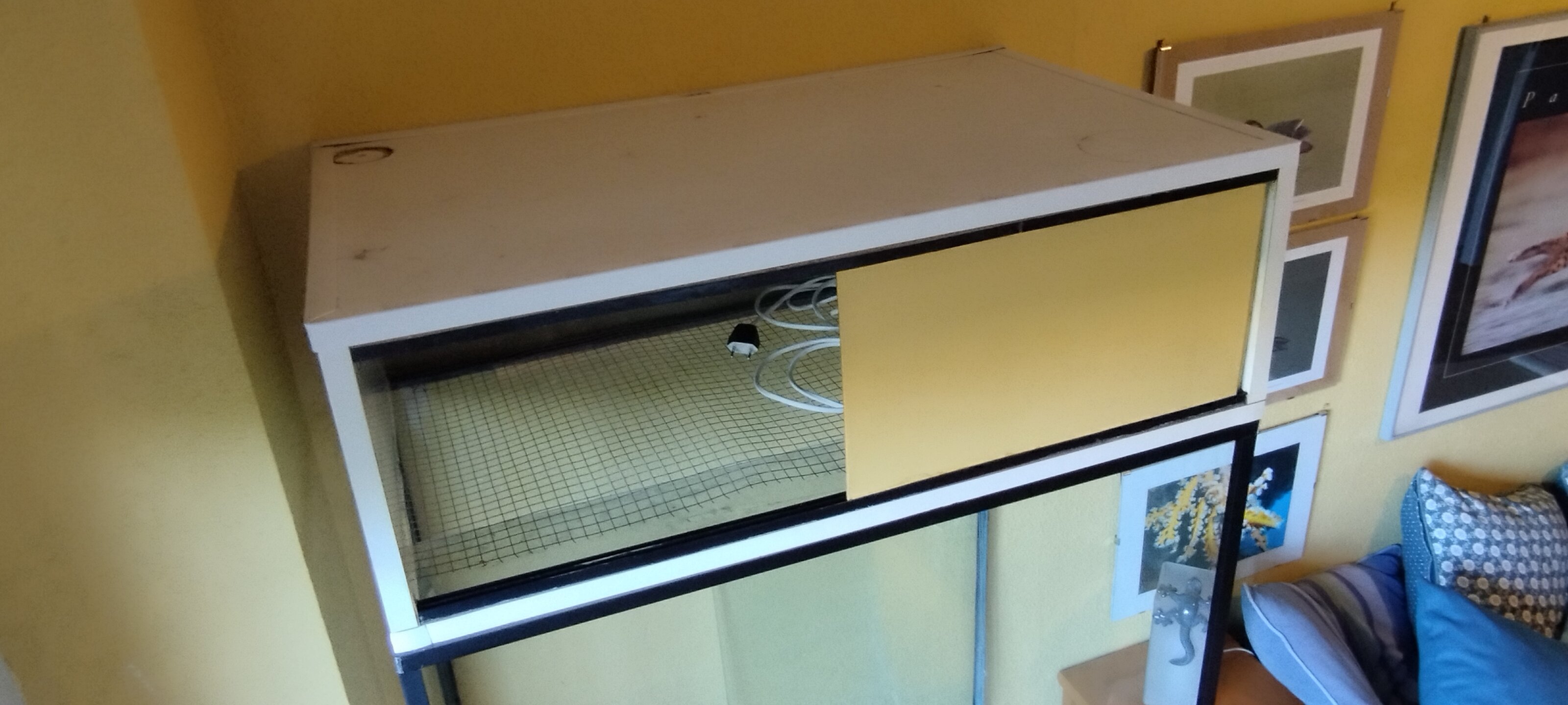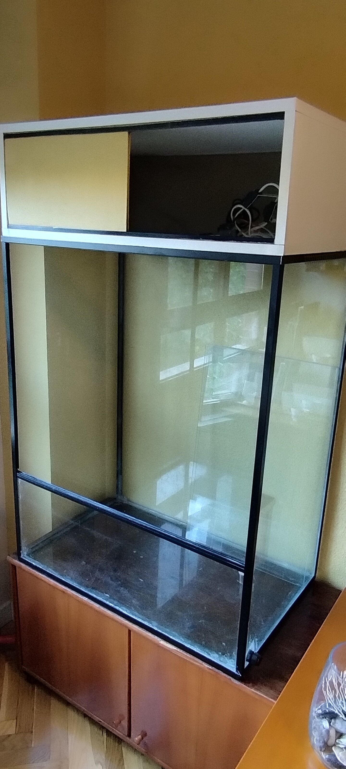 Terrario de 1 metro de alto, por 50 de fondo y 80 de ancho, perfecto para montar un ecosistema con agua, dispone de desagüe. Le falta la malla superior de ventilación. Precio - 230 euros