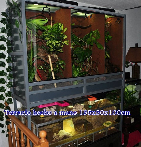-1 Terrario hecho a mano. Paredes de PVC con estructura de aluminio y malla de acero inoxidable. Frontales de cristal. Incluye patas por si se quiere alzar. Yo lo tenía con las patas puestas y clavado a la pared. Habría que hacer el fondo de nuevo con espuma de poliuretano. Medidas 135x50x100cm (alto). Está dividido en dos de 50x50x100cm y otro de 35x50x100cm. Precio: 300€.