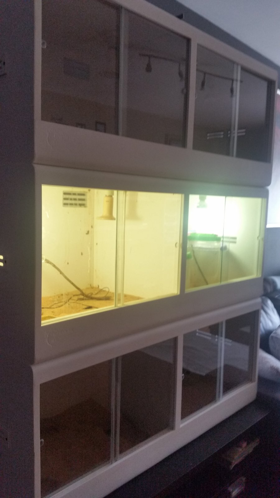Pongo a la venta 3 terrarios de Reptilium Box con muy poco uso las medidas de cada uno son de 120x50x50 dividido por la mitad cada terrario. con 4 casquillos cada terrario para lampara ceramica e iluminacion. tambien vendo el mueble en el que van tiene ruedas y dos cajones y bandeja muy grandes para guardar el material, puedo vender por separado los terrarios o hago oferta por los tres y el mueble.