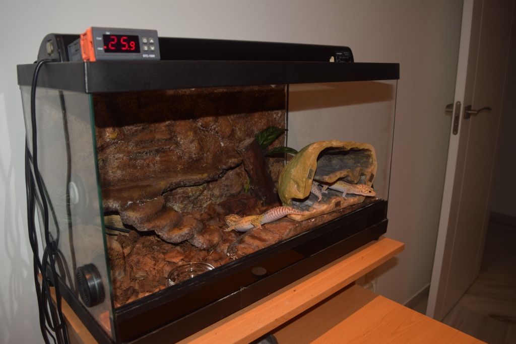 Vendo dos hembras de gecko leopardo (Eublepharis macularius) con su terrario 60x30x30 completamente acomodado a sus necesidades, incluyendo un fondo hecho a mano, manta térmica, termostato, termómetro, higrómetro, cueva magnética, roca eléctrica, cultivo de tenebrios, lámpara de tubo, bote de calcio y más cosas.