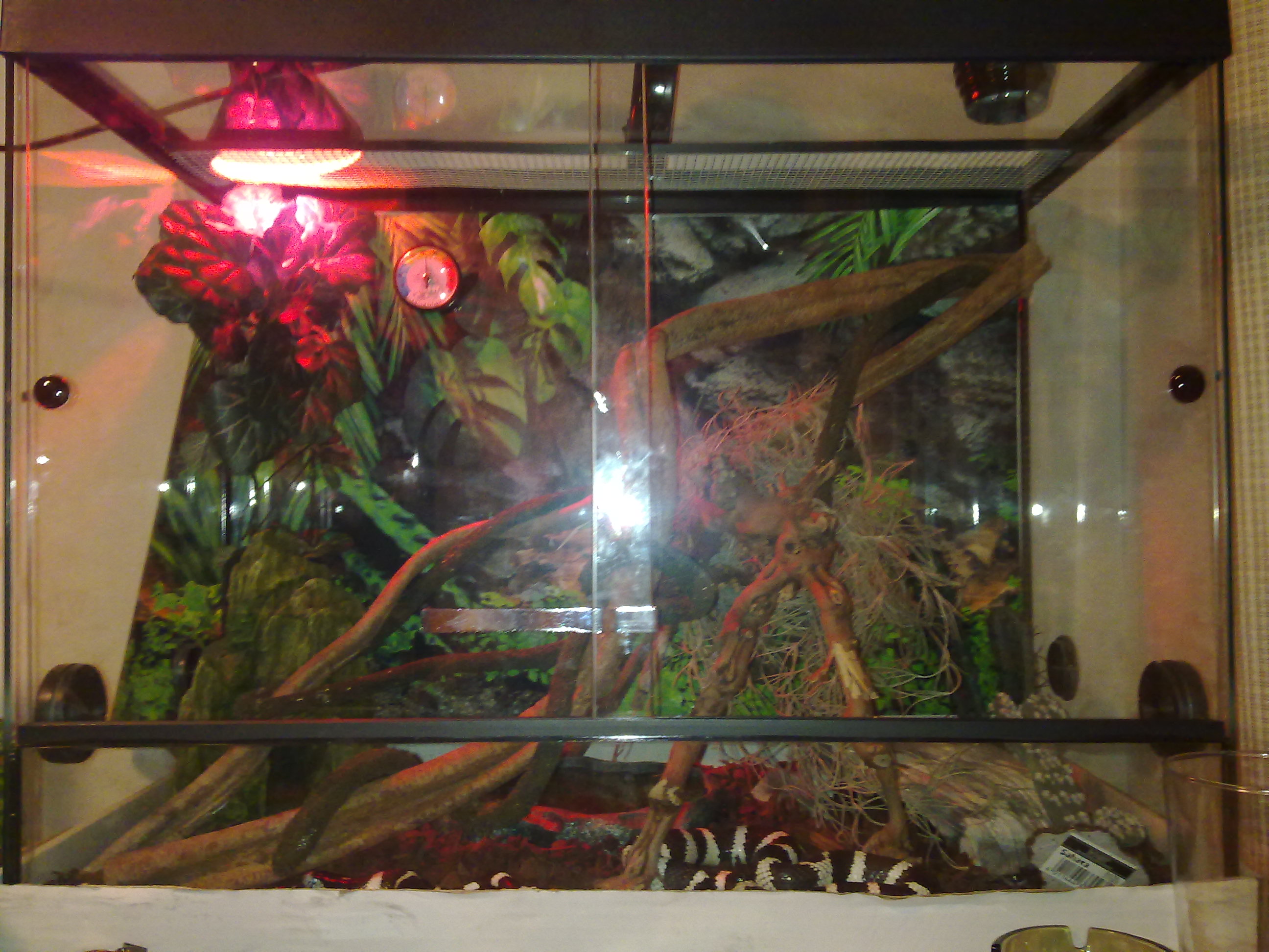 la temperatura oscila entre los 25 y 30 grados en la zona caliente, aqui te subo una foto de mi terrario para q me des tu opinion si lo tengo bien o no gracias