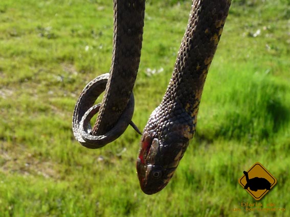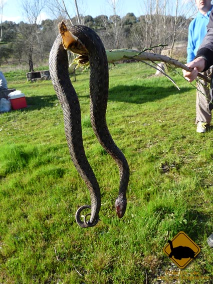 Por último lo más desagradable de la semana. La ignorancia de algunas personas pueden llevarlas a cometer barbaridades. Entre los matorrales aparece un señor de mediana edad, portando un palo en cuyo extremo opuesto colgaba una preciosa Natrix maura.
