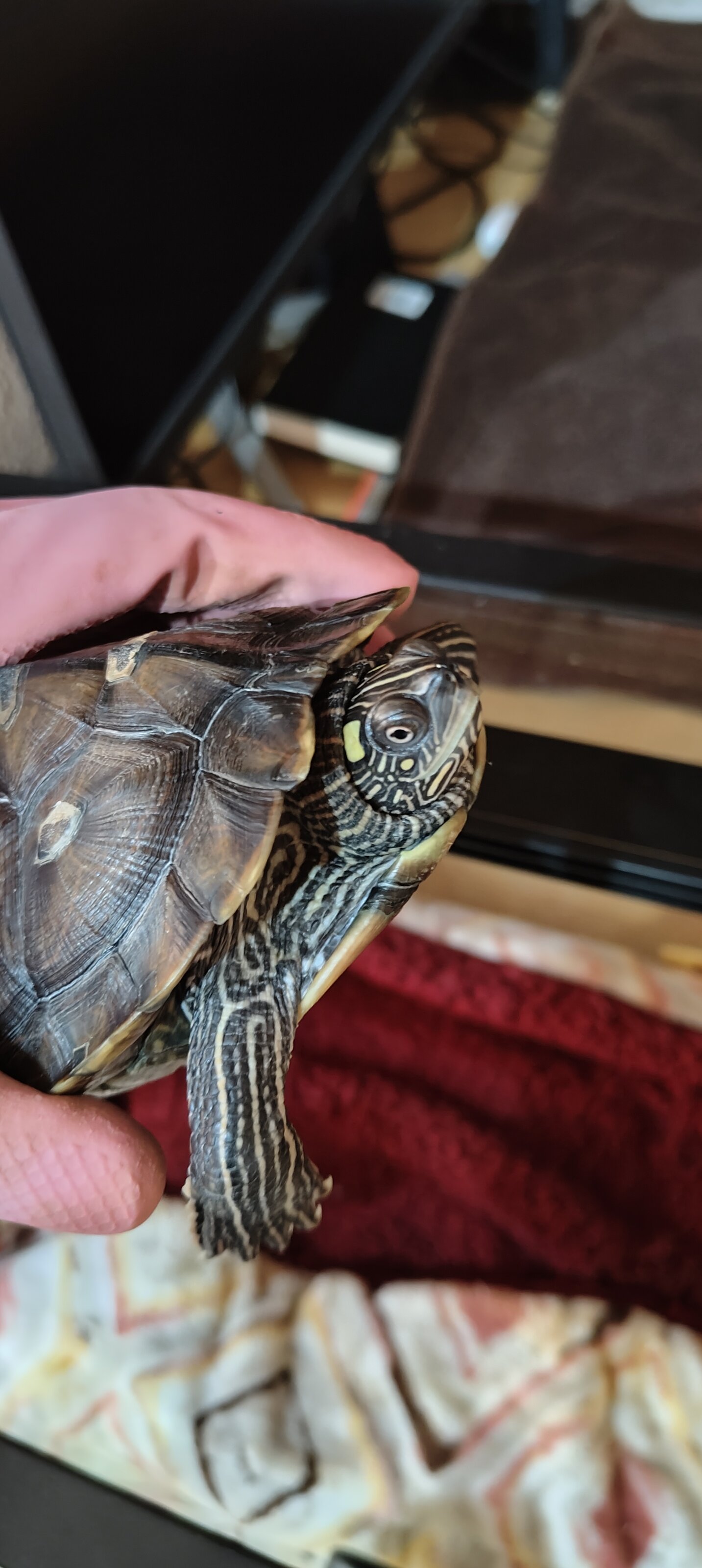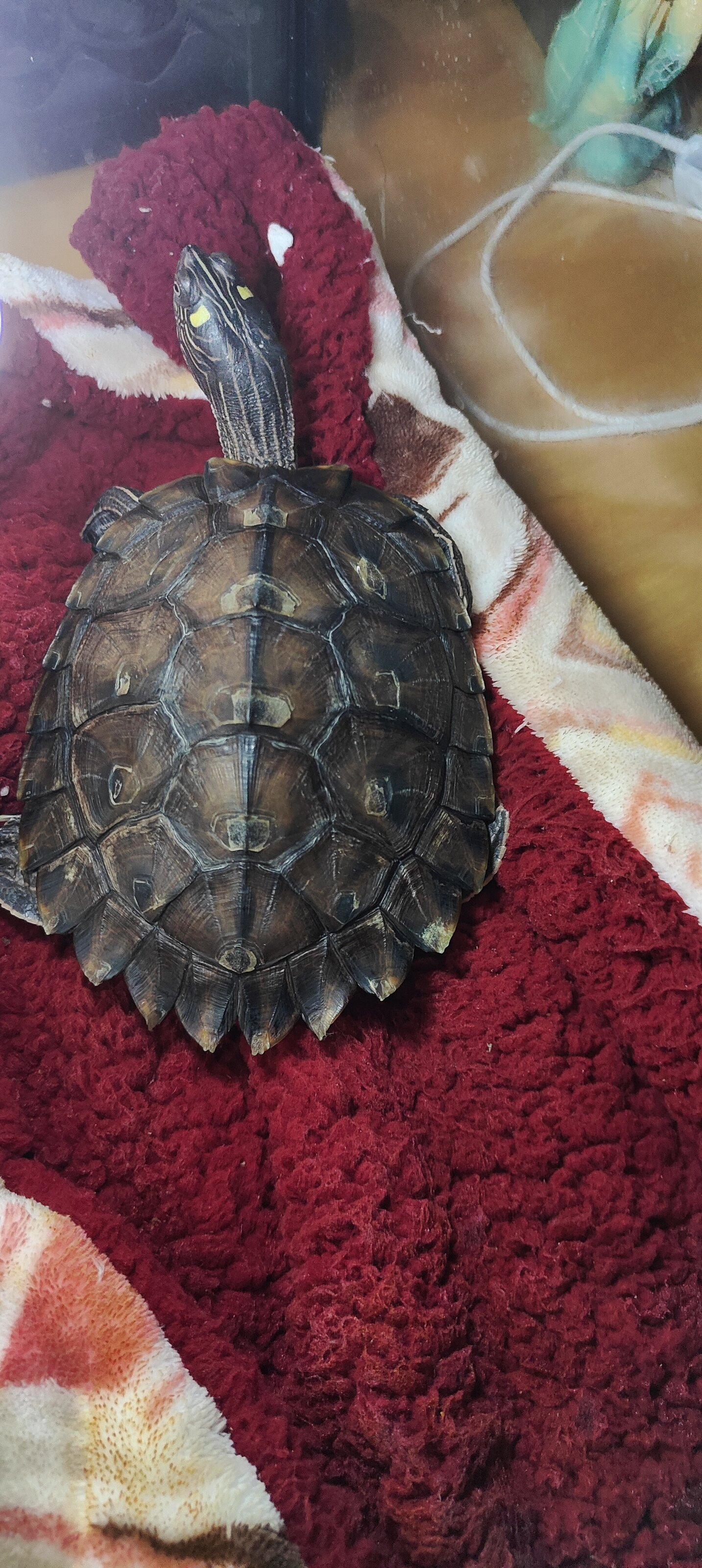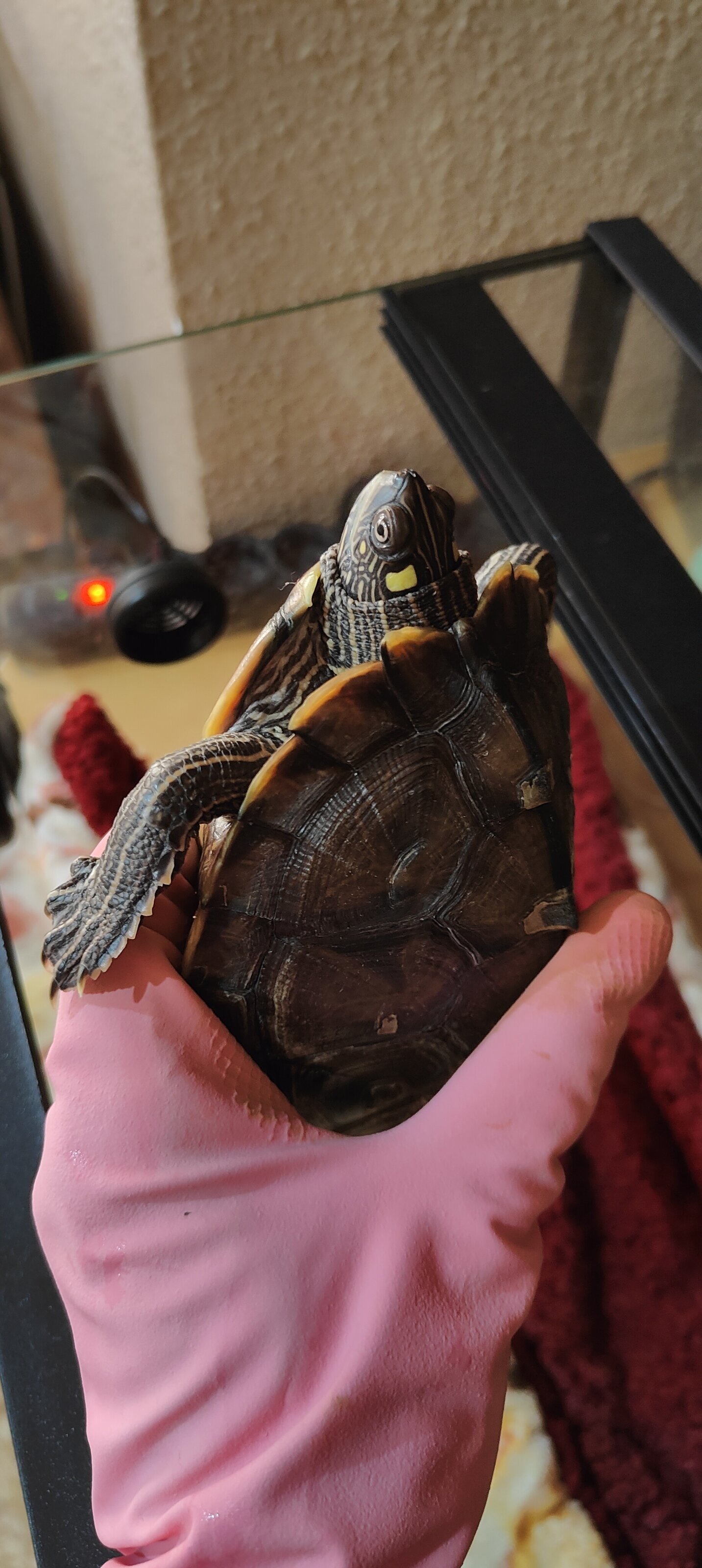 Actualmente tengo dos tortugas de la misma especie, en un acuaterrario de 120L. Ambas han sido siempre cuidadas con mucho cuidado y cariño, obviamente tienen su termostato, zona seca arriba (hecha a mano por mi con metacrilato, con su subida de cesped y bombillas de calor y UVB aparte), comida variada (pellets, pollo, gambas, salmon....), filtro externo canister + filtro de cascada en acuario, etc. Con su agua siempre cristalina.