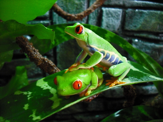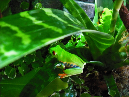 Ahora les gusta descansar en el envés de las hojas por el día, siempre. Les tengo puesta iluminación por el tema de las plantas y bien, si quisieran luz pienso que se expondrían directamente a ella, pero se entremeten entre las hojas y reciben la luz más bien indirectamente, será el gusto de esta especie pienso yo... porque tengo la experiencia de que otras arborícolas de climas templados se ponen a plena luz por el día... por otro lado leo mucho que no necesitan demasiado la radiación, es un tema que veo que la gente no se aclara mucho...