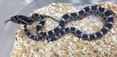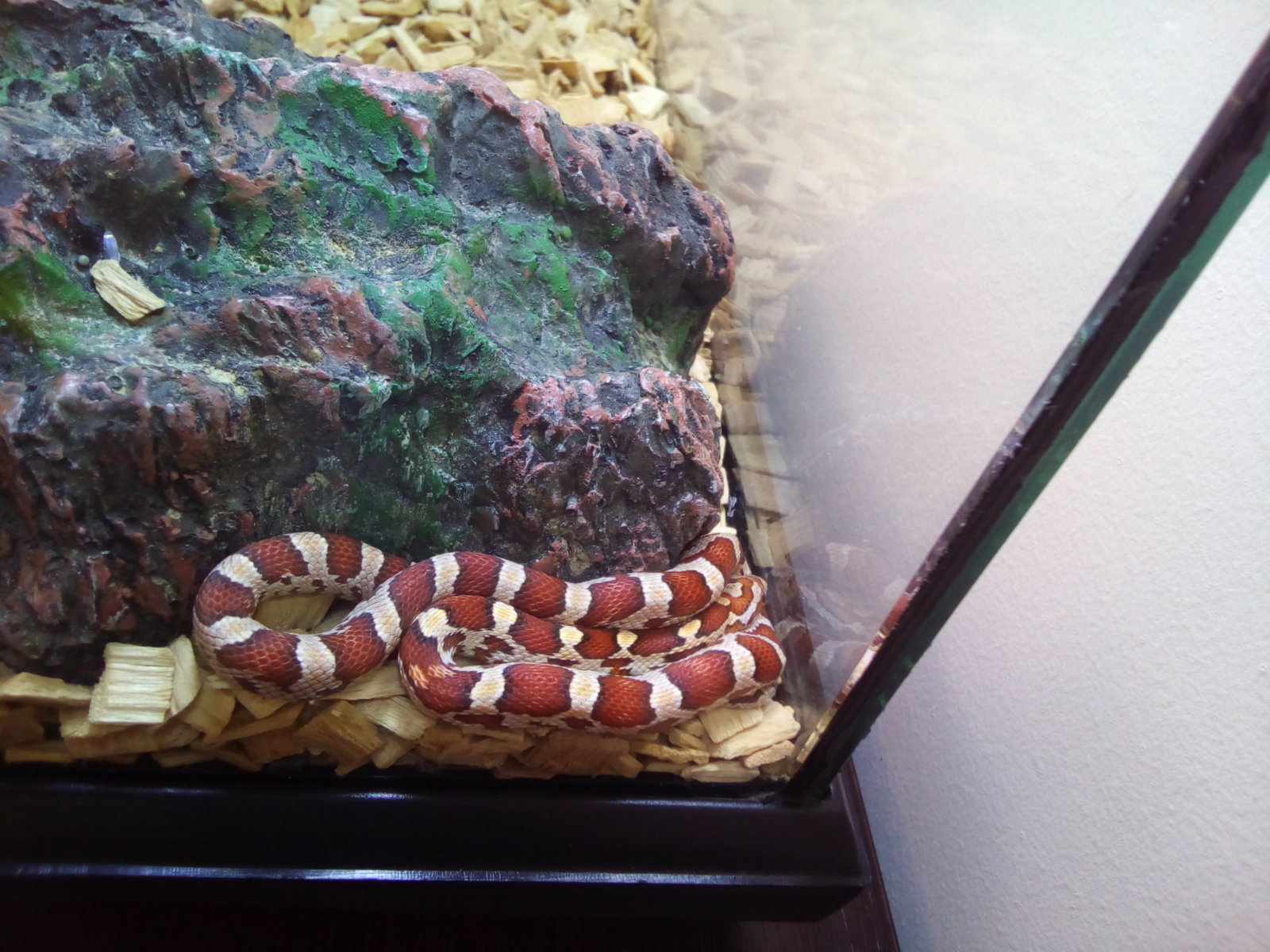 Esa fase se llama Anery. Los cuidados están en 8000000 sitios, con que pongas en Google cuidados de Panterophis guttatus o cuidados de la serpiente del maíz te salen. Pero así por encima, necesitan un terrario de unos 60cm de largo, 35 ancho y alto unos 40, ten en cuenta que crecen sobre 1,5metros de largo y que cuanto más grande sea el terrario mejor. Necesitan una temperatura de unos 32 grados, que se los puedes proporcionar con una manta térmica o un cable térmico, mas recomendada la manta porque distribuye mejor el calor.La tienes que colocar de modo que ocupe un tercio o la mitad del suelo del terrario, y obviamente por fuera de este. Termómetros e higrometros o termohigrometros los puedes conseguir en las tiendas de animales o en páginas web, una marca bastante buena es Exo-Terra. También los hay digitales. Respecto a los accesorios, puedes ponerle troncos para que trepen, luego un bebedero y un refugio en el lado caliente(el lado donde esta la manta térmica) y otro refugio en el lado frío(donde no hay manta).No necesitan luz uvb pero si necesitan reconocer el fotoperiodo, es decir, que les llegue la luz ambiental y sepa cuando es de día y de noche. De comer le puedes dar, dependiendo del tamaño de la serpiente, pinky de raton o rata(más nutritiva de rata, pero también mas grande) cuando es baby y según va creciendo ya le vas dando mas grandes. Cuando acaba de nacer es mejor darle unas cuantas veces vivo y después mejor darle muerto, que se suele comprar en las tiendas congelado. Si tienes mas dudas pregunta, pero por favor, antes infórmate en los demás posts que están mas completos.Un saludo amigo.