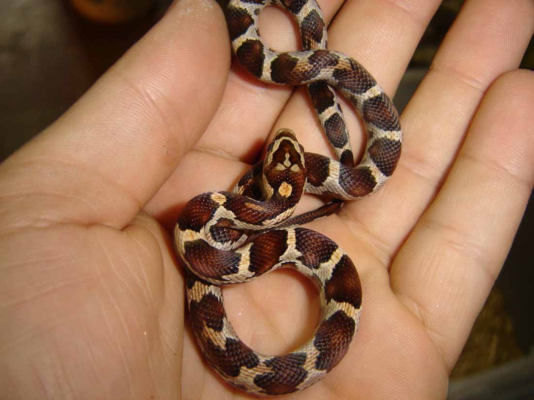 Por ejemplo la que pones como Lampropeltis x guttata albino x gutatta anery hetero snow podria ser: