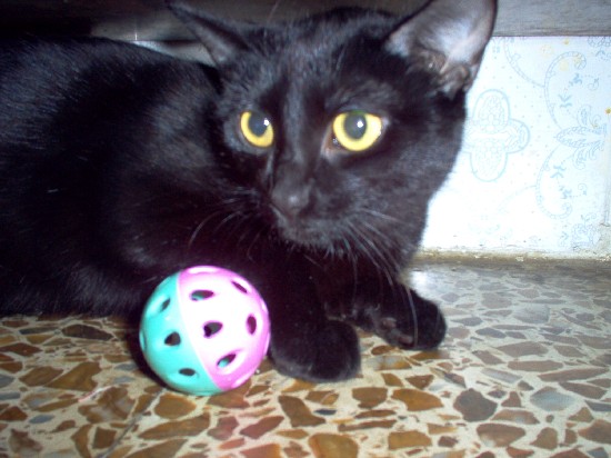 Shadow con su pelota de cascabeles jejeje ....una gatita negra que de verdad es un amor se deja coger por todo el mundo; tb tiene tres añicos: