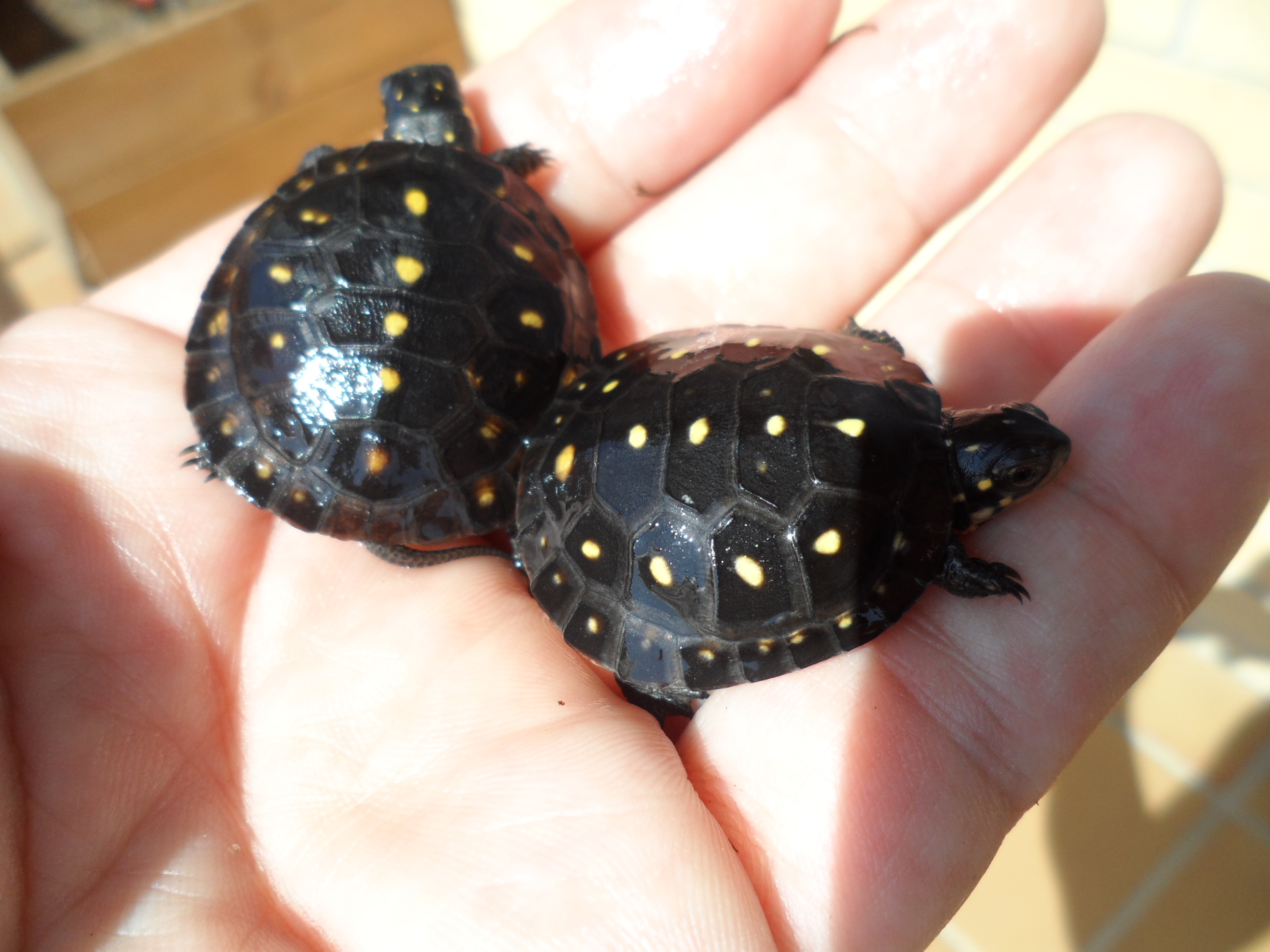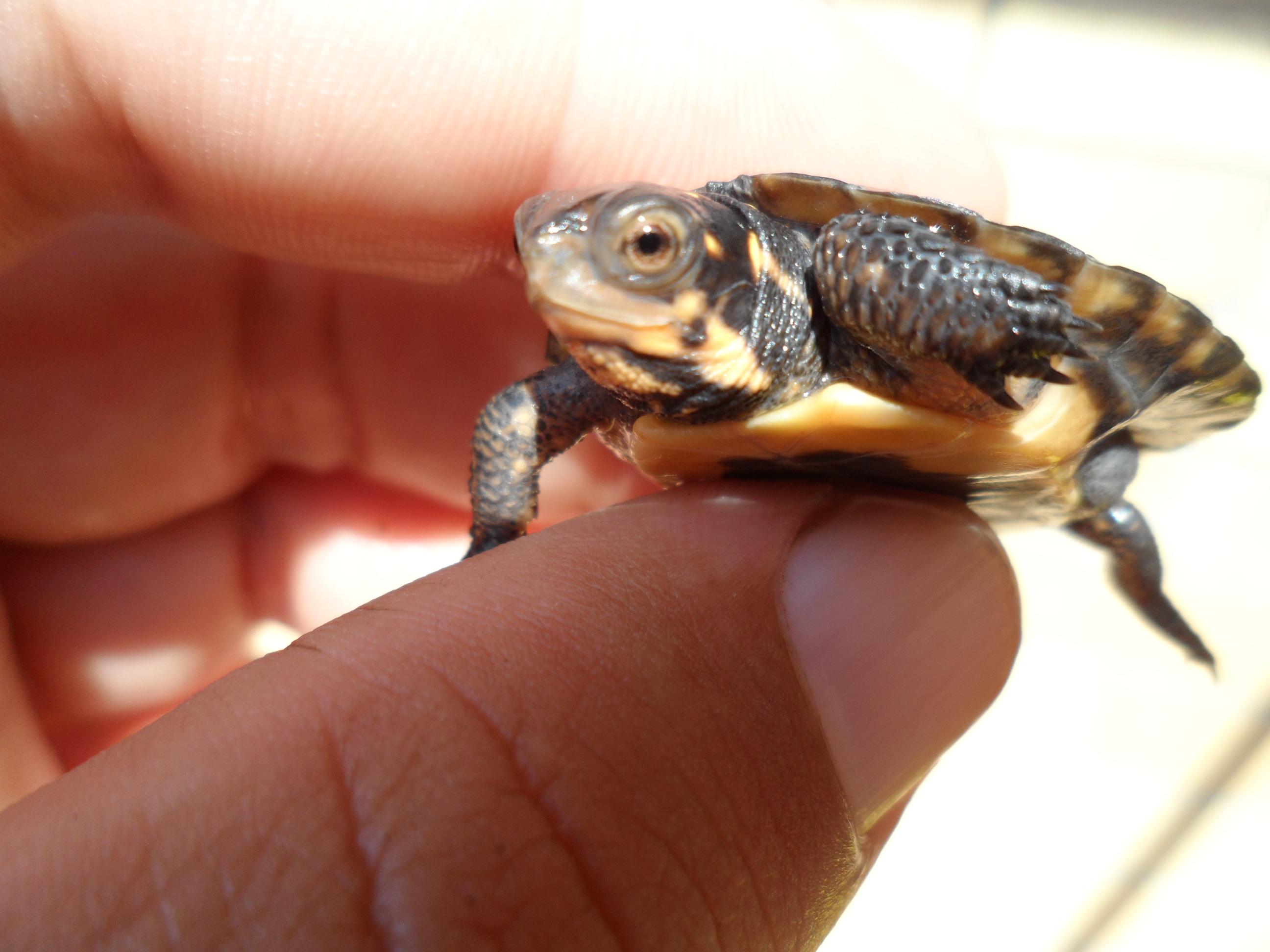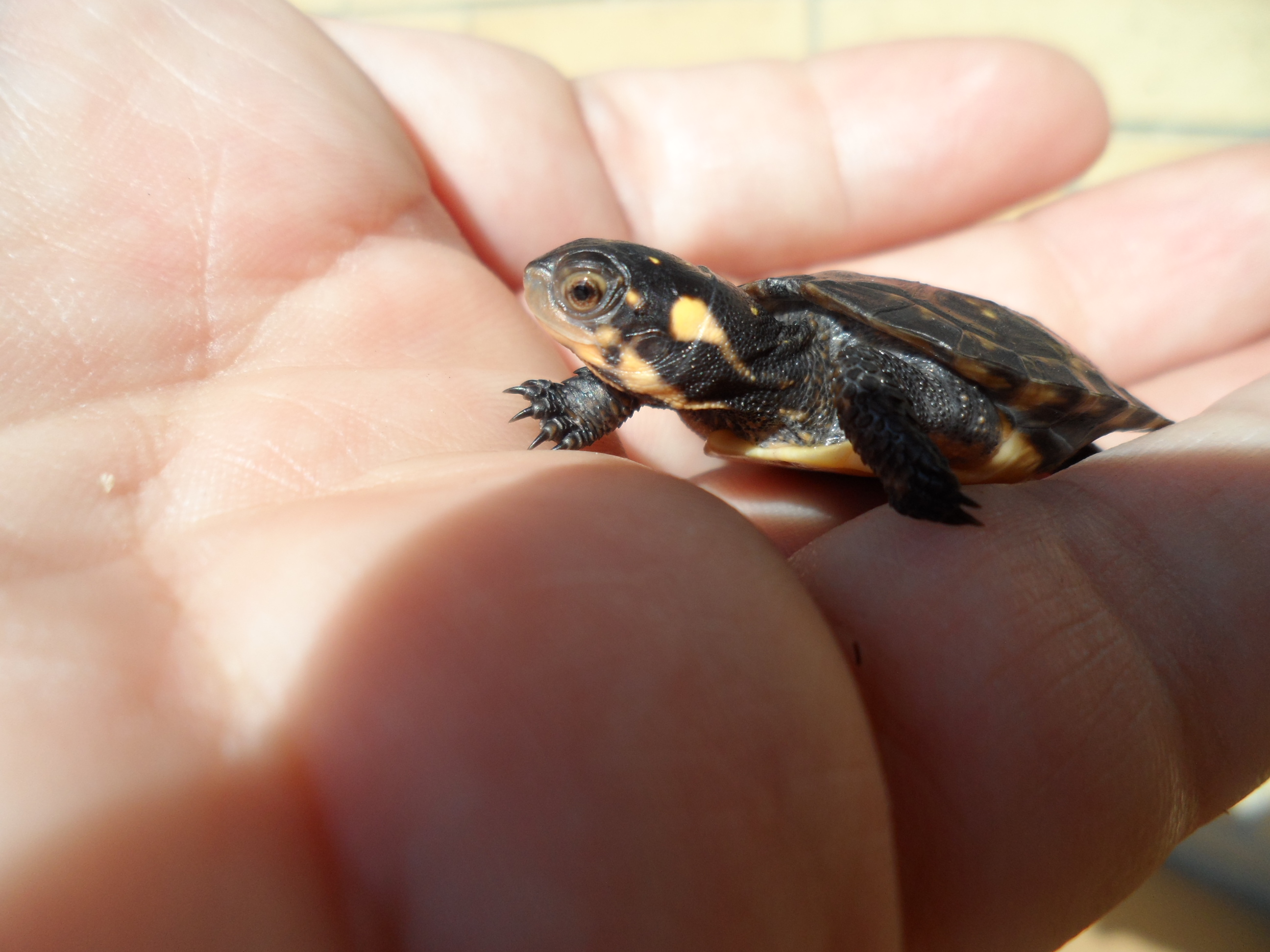 Para rizar el rizo,despues de todos las puestas que recogi(unos 30 huevos)la semana pasada encontre en el estanque 2 clemmys babys que salieron de alguna que no localize....