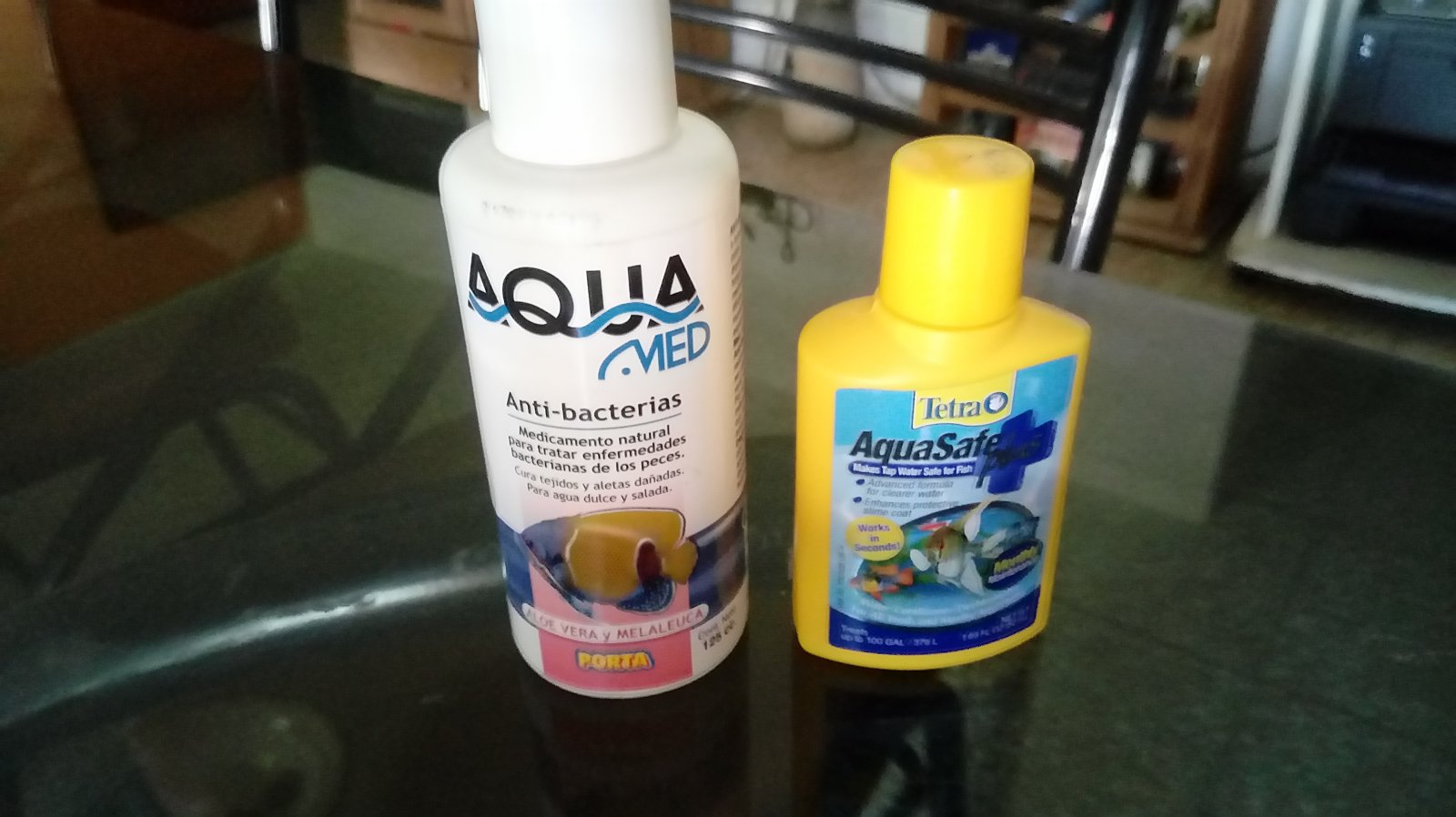 lo empezamos a tratar de la siguiente manera cambio de agua cada 3 dias de 1 tercio durante tres días y en esos cambios dos gotas por litro de aquasafe.