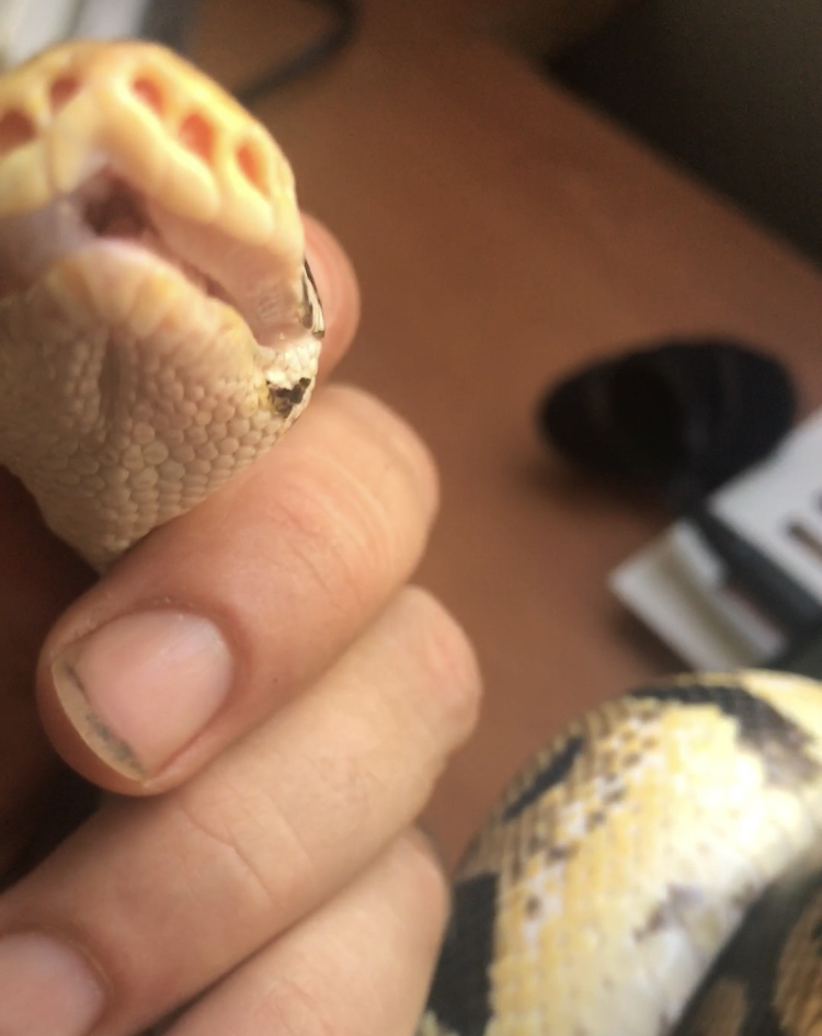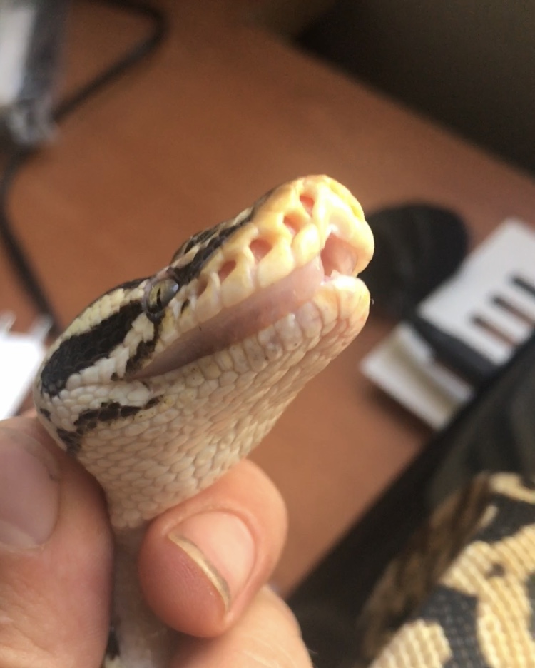 Eso es una estomatitis. Muy frecuente en boidos (mal o regular cuidados). Puede ser porque hay algún parámetro mal, como la temperatura y/o la humedad o también que proceda de un diente roto a causa de los empujones sobre el cristal. Esto último podría ser por hambre, por ejemplo, pero no tiene por qué serlo obligatoriamente.