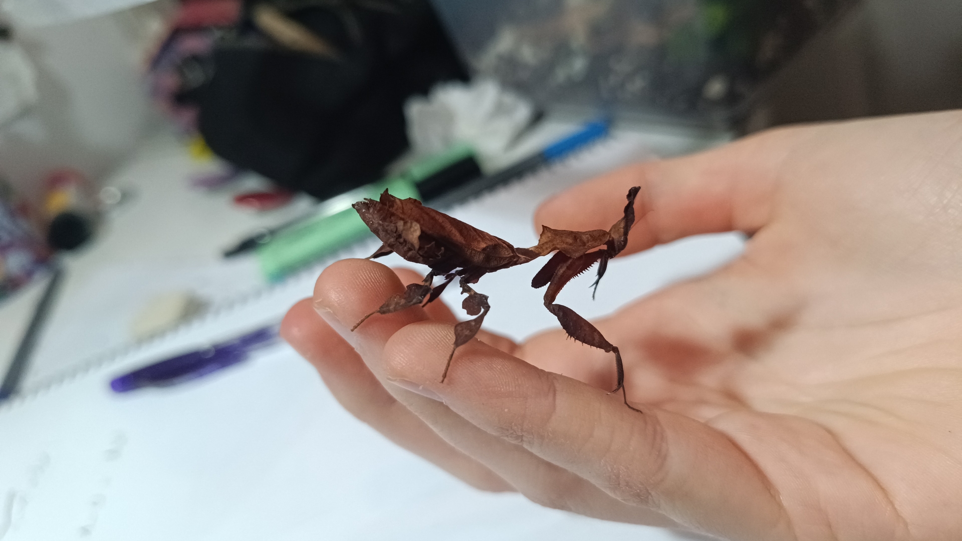 Hola, es mi primera vez teniendo mantis. Y ahora mismo tengo una mantis Phyllocrania paradoxa hembra, que ya ha alcanzado su última muda, es decir, está en fase adulta. Concretamente, hace dos meses. No se qué hacer, pues lleva casi un mes rechazando comida. Le he ofrecido variedad, incluso he partido a algunas presas para que pueda sentir el sabor, pero se niega. Siempre ha comido de maravilla todo lo que le ofrecía, y ahora ya no entiendo. Tal vez esté en etapa de reproducción, pero noto su abdomen inflado a pesar de no haber comido nada. Por favor, ayuda