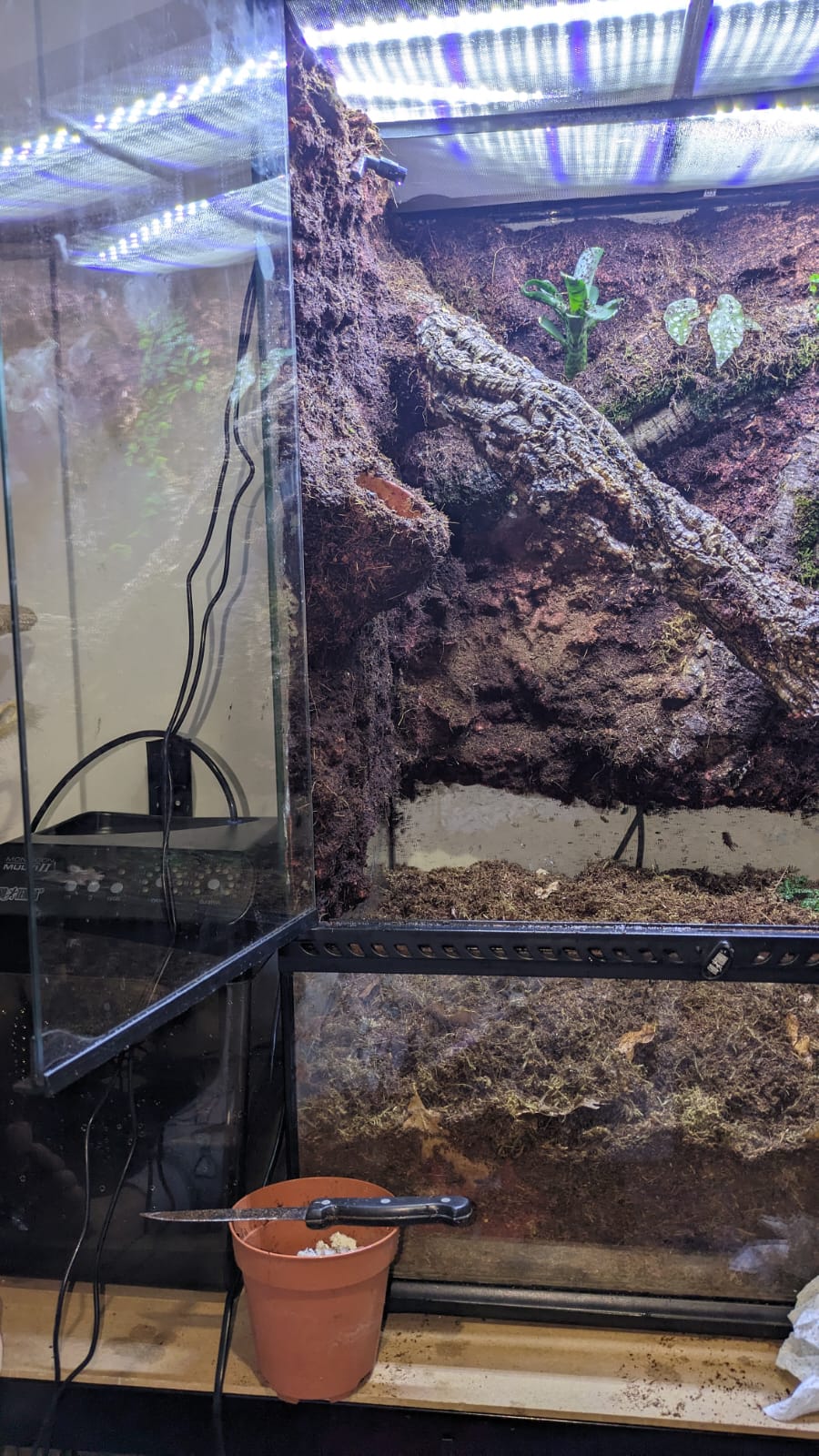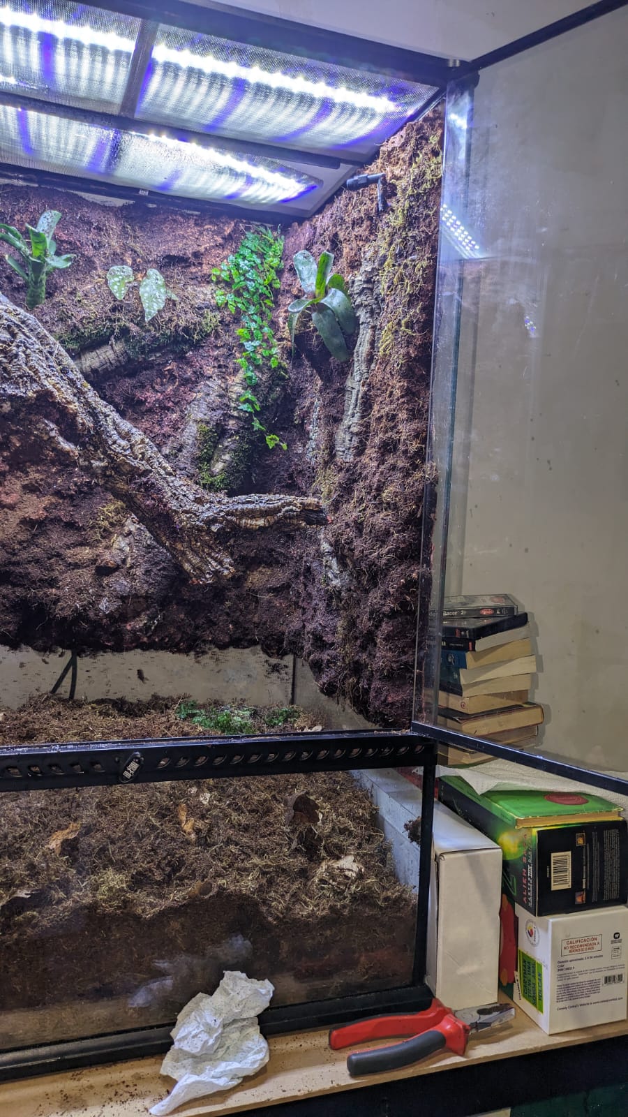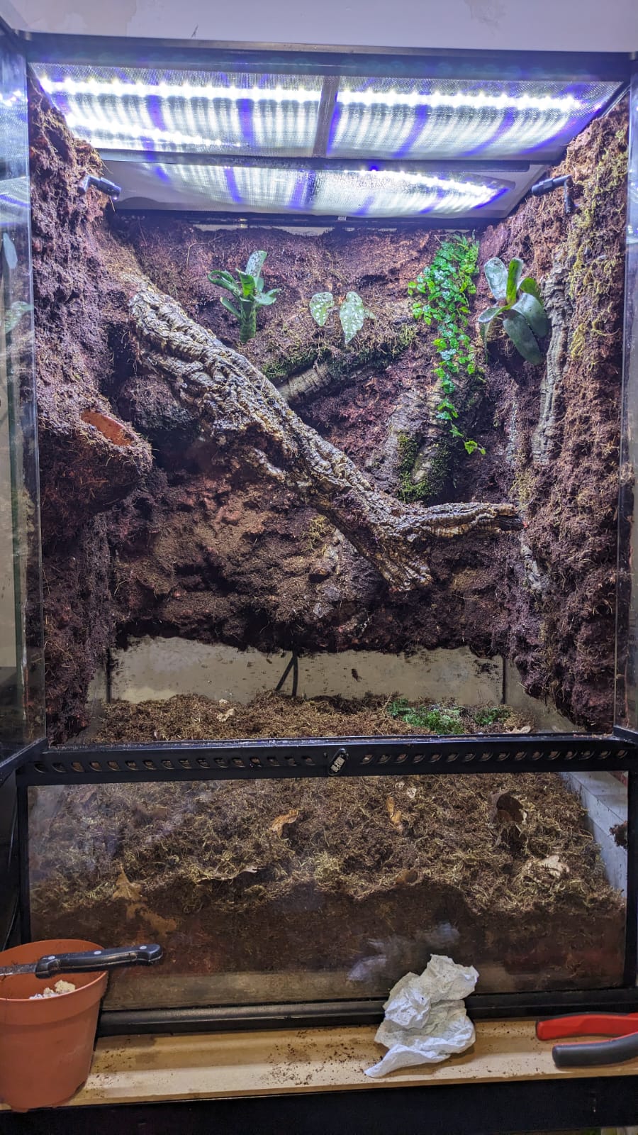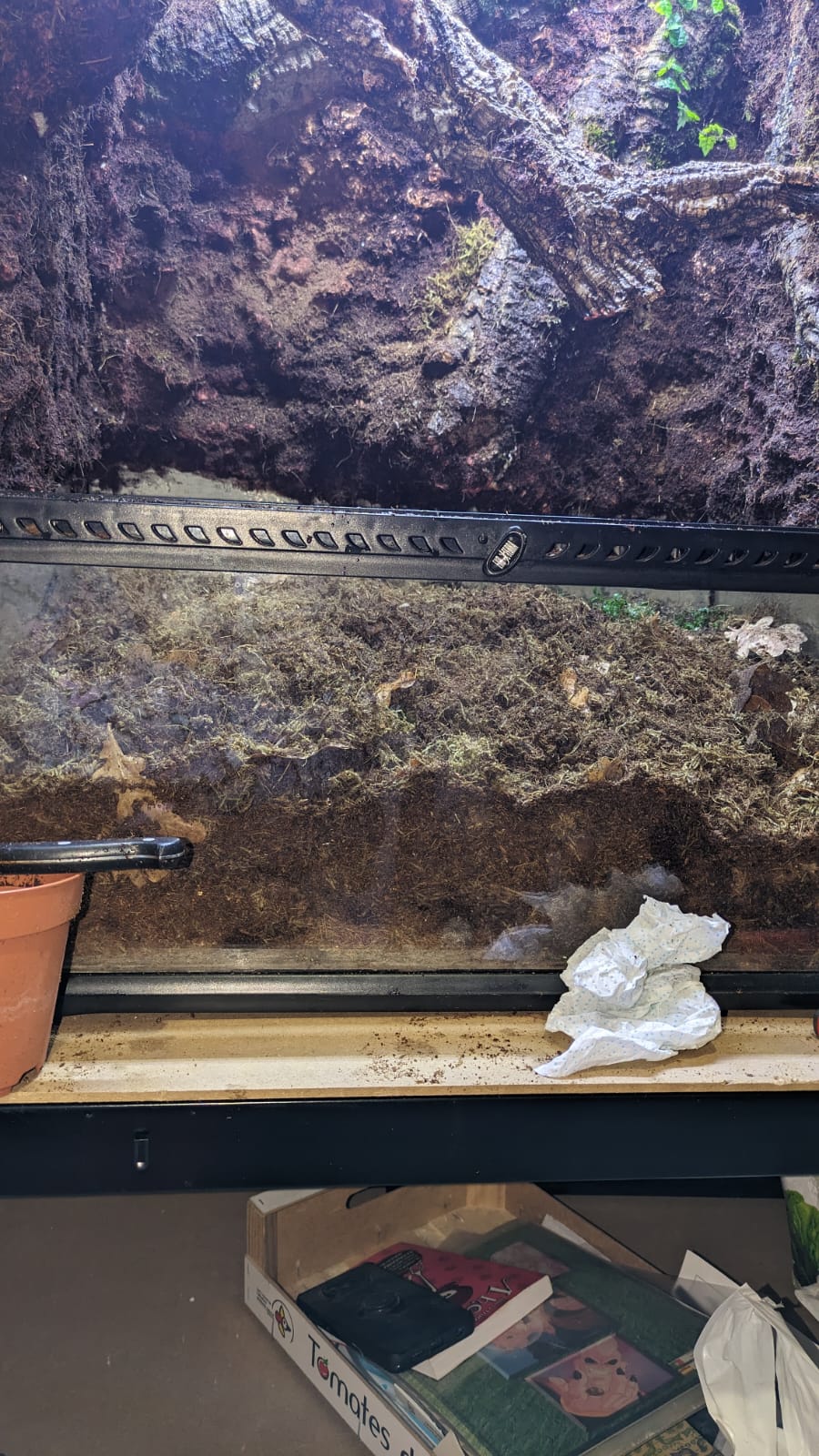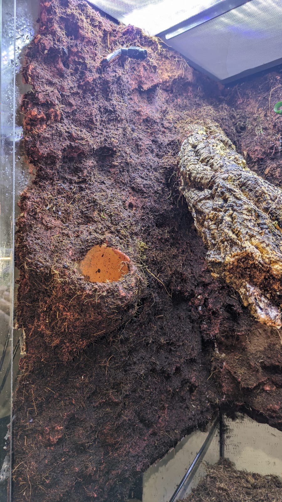 He probado a estirar lo más para arriba la tierra pero sigue viendose el agujero y encima se ve como medio terrario solo tierra, los bordes tanto de arriba como hacia las puertas se ven sin terminar y todo el fondo con manchitas blancas como si lo que entiendo que es fibra de coco se estuviese despegando y tocas y está como humedo y blandito pero ya no sé si eso se supone que tiene que estar así. En la parte izquierda no hay relieve de fondo ni nada, es una pared lisa marrón y delante una maceta que sale de la nada y parece una boñiga pegada y ya ta. Nose, hablando desde el ataque de ansiedad que me ha generado el día de hoy pero he estado a nada de arrancarlo todo.