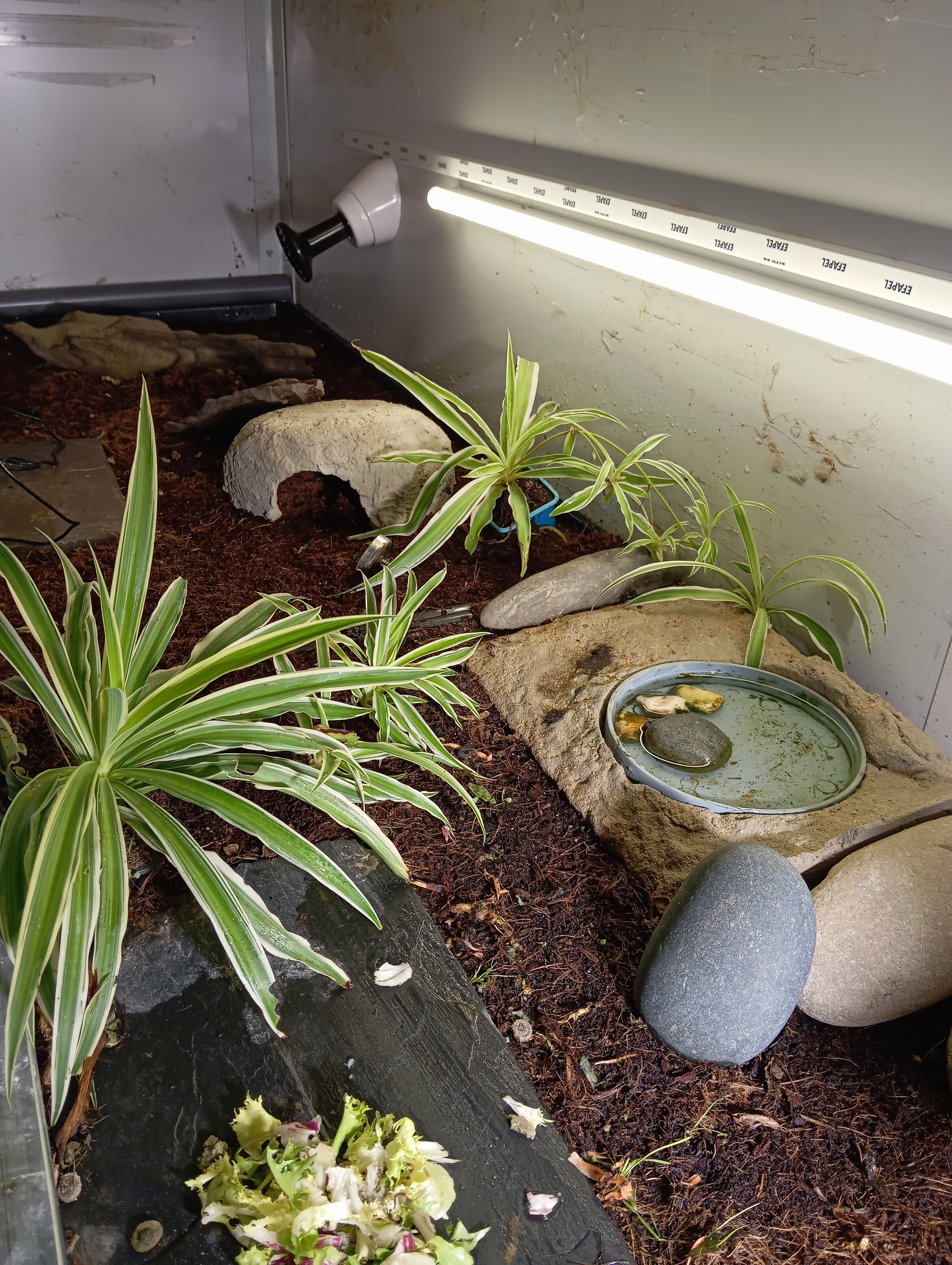 Hola me presento mi nombre es Xavi y soy nuevo en el foro , soy un enamorado de las tortugas terrestres,en noviembre adquirí 3 pardalis que es una especie que me encanta , dispongo de ejemplares de otras especies como graecas , Hernani , rusas y carbonarias , la cuestión es que las pardalis estuvieron bien hasta dos meses después de adquirirlas , dejaron de comer y por desgracia perdí a dos de ellas , la que me quedó perdió peso progresivamente y apenas comía , ahora desde hace un mes a vuelto a recuperar el apetito y va ganando peso a dos gramos a la semana ( más o menos) disponen de un terrario de 220cm por 60 por 60 hay dos lámparas cerámicas de 50 w una bombilla hid de 35w y fluorescentes de 9w de 4000k la cuestión es que el ejemplar que a quedado siempre esta en la parte donde no da la luz directa y no se mueve ,únicamente para comer ,el sustrato es fibra de coco no sé si hay algo que no realizó bien o no está bien en el terrario , (podría ser la proximidad de la luz o el sustrato ) os estaría infinitamente agradecido ya que me gustaria adquirir otro ejemplar pero no las tengo todas conmigo , gracias de antemano , adjunto foto del terrario