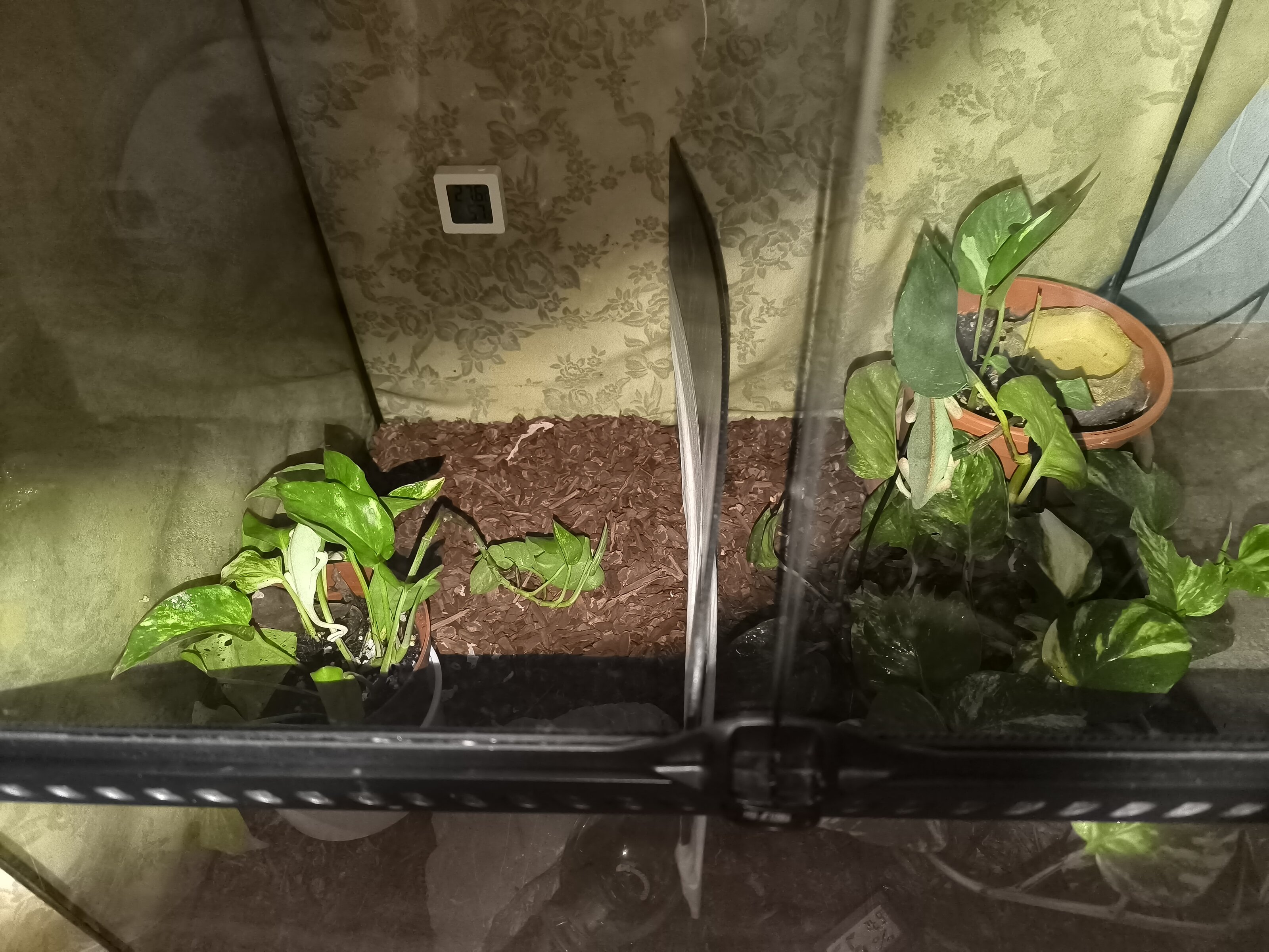 Hola tengo la pareja de camaleónes el caso es que tuve que separarlos porque la camaleona no comía.El camaleón se ha puesto grande y ella sigue raquítica... Ahora ya ni come ,tiene dentro en la boca algo como negro y la estoy hidratando con agua en una jeringuilla porque ni eso... No sé debido aque puede ser porque la temperatura es correcta y la humedad también...
