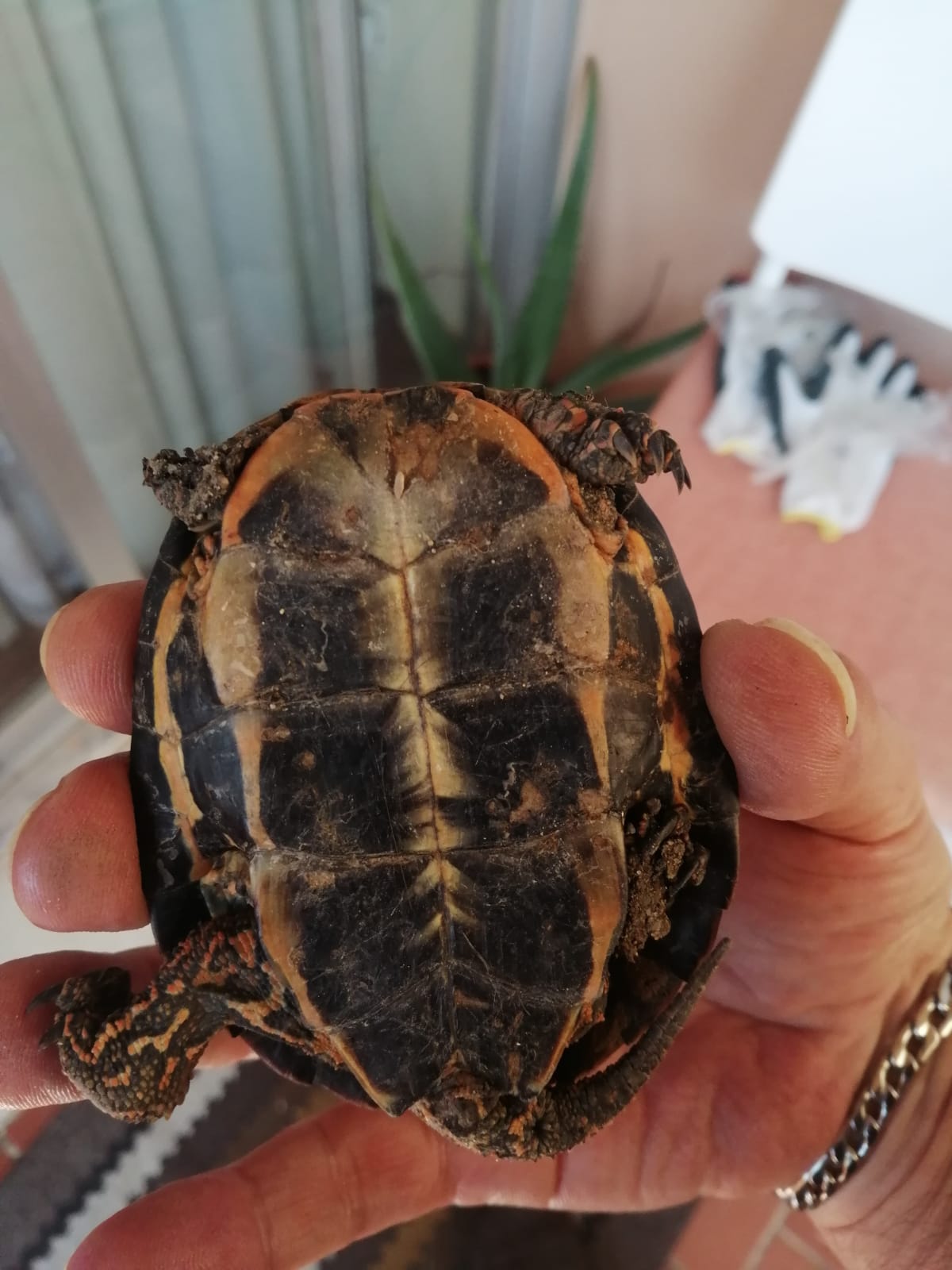 Hola buenas hace poco encontre esta tortuga, ya que vi que estaba mal, le faltaba un cachito de una pata y la parte de la uña en otra, decidi llevarla a casa para que este mas comoda y tenga una vida mejor. El caso es que queria saber de que especie se trata, para poder darle los mejores cuidados que necesite. Os dejo unas fotos, gracias de antemano.