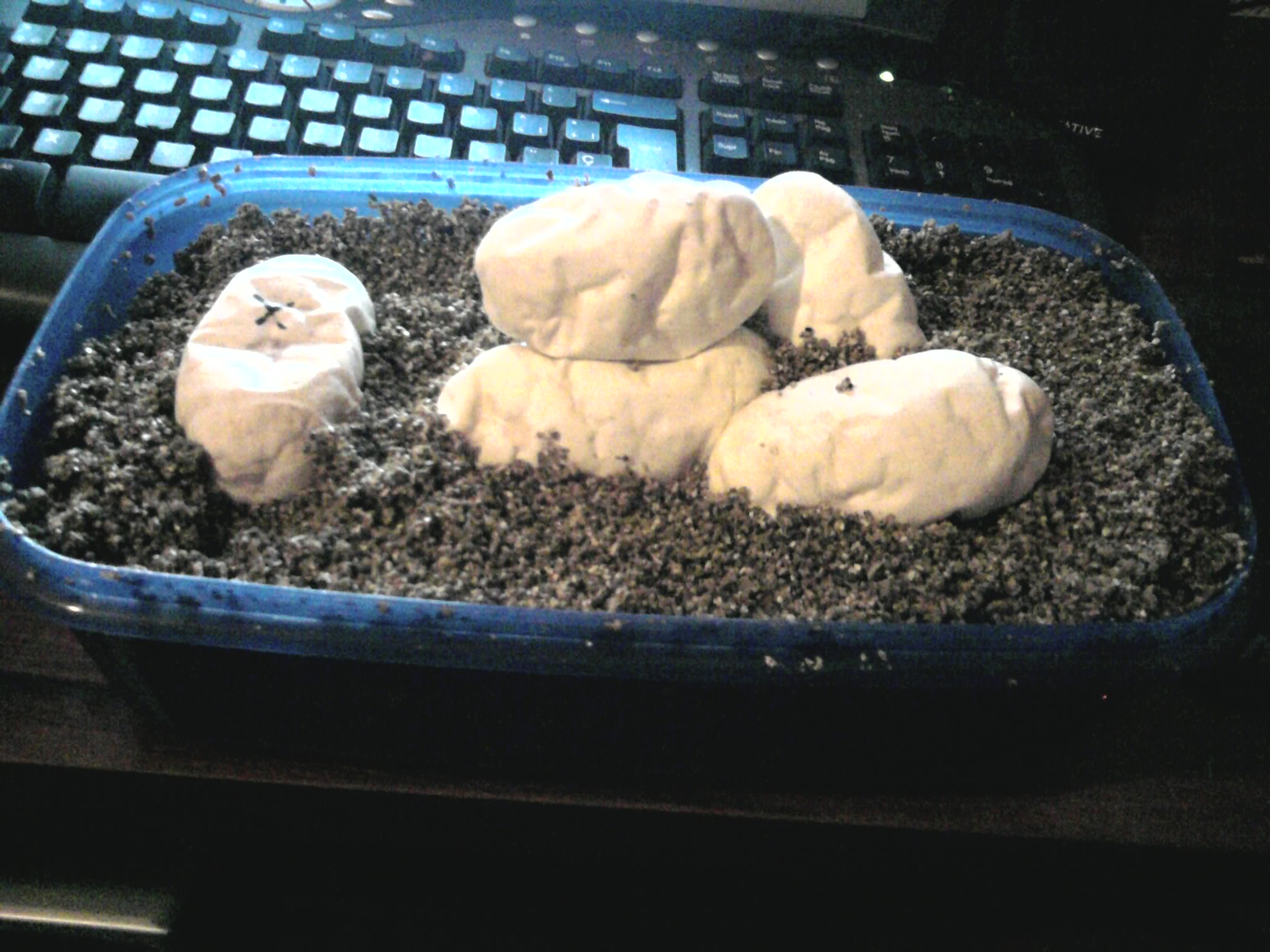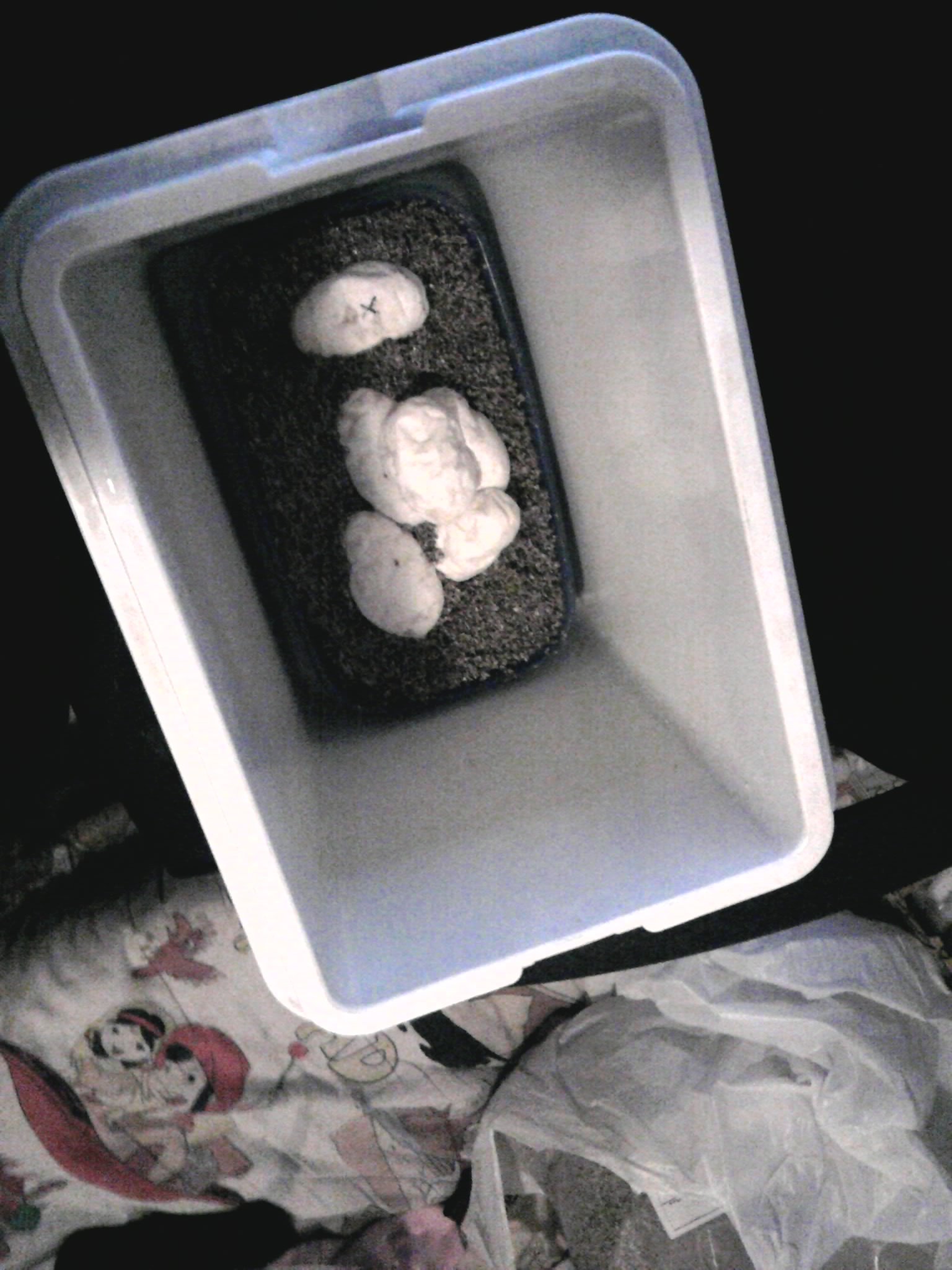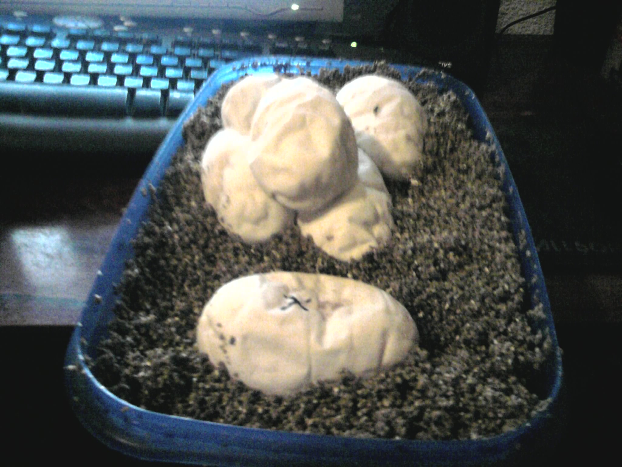 Ademas el terrario tiene en 1/3 manta termica, y 5 huevos estan pegados, y los a puesto de tal forma que uno de ellos esta la mitad encima de la manta termica, y los otros fuera.