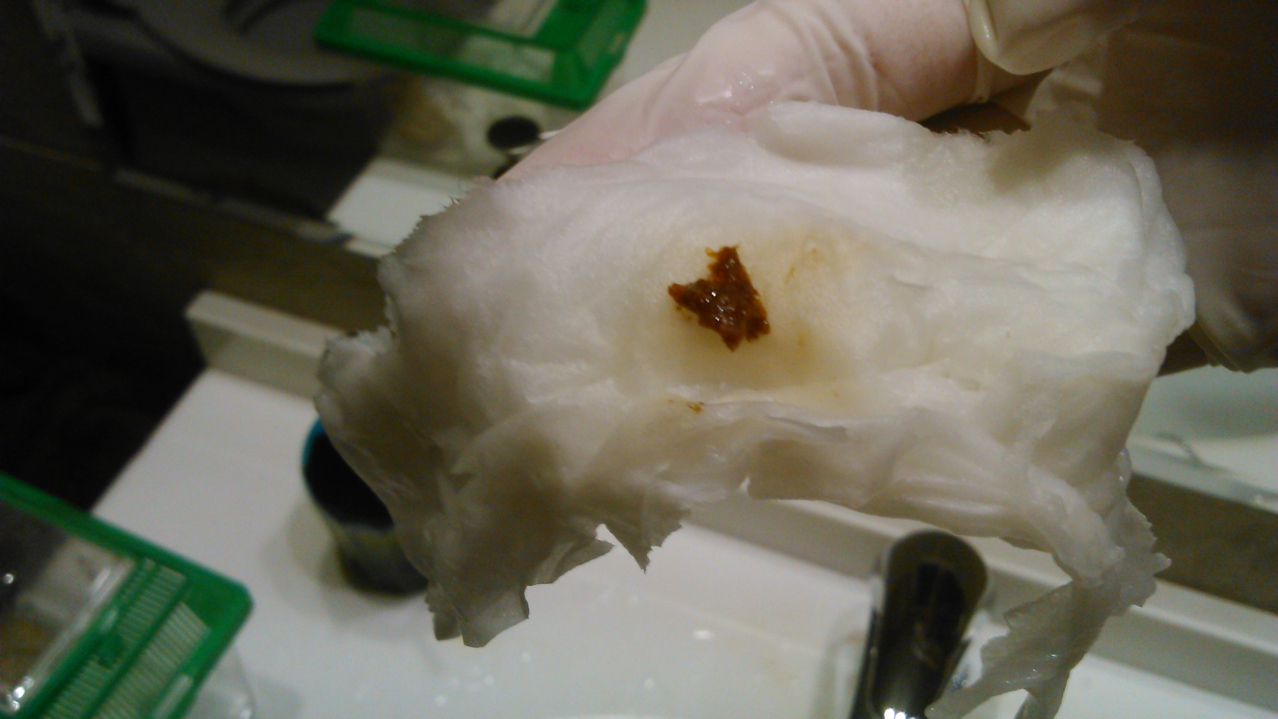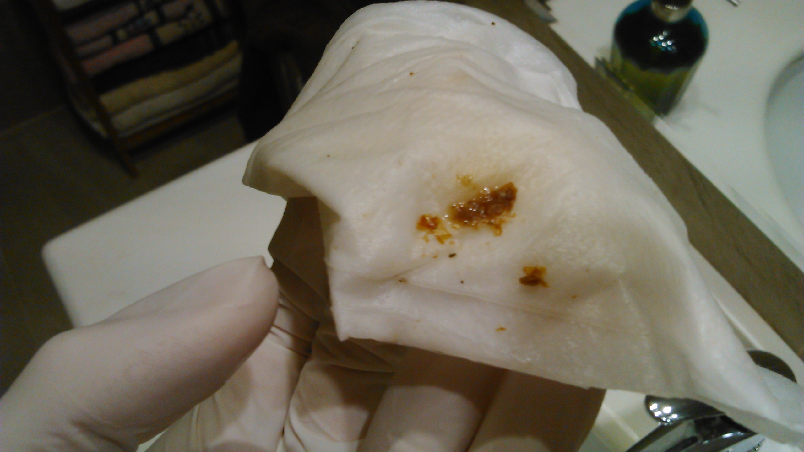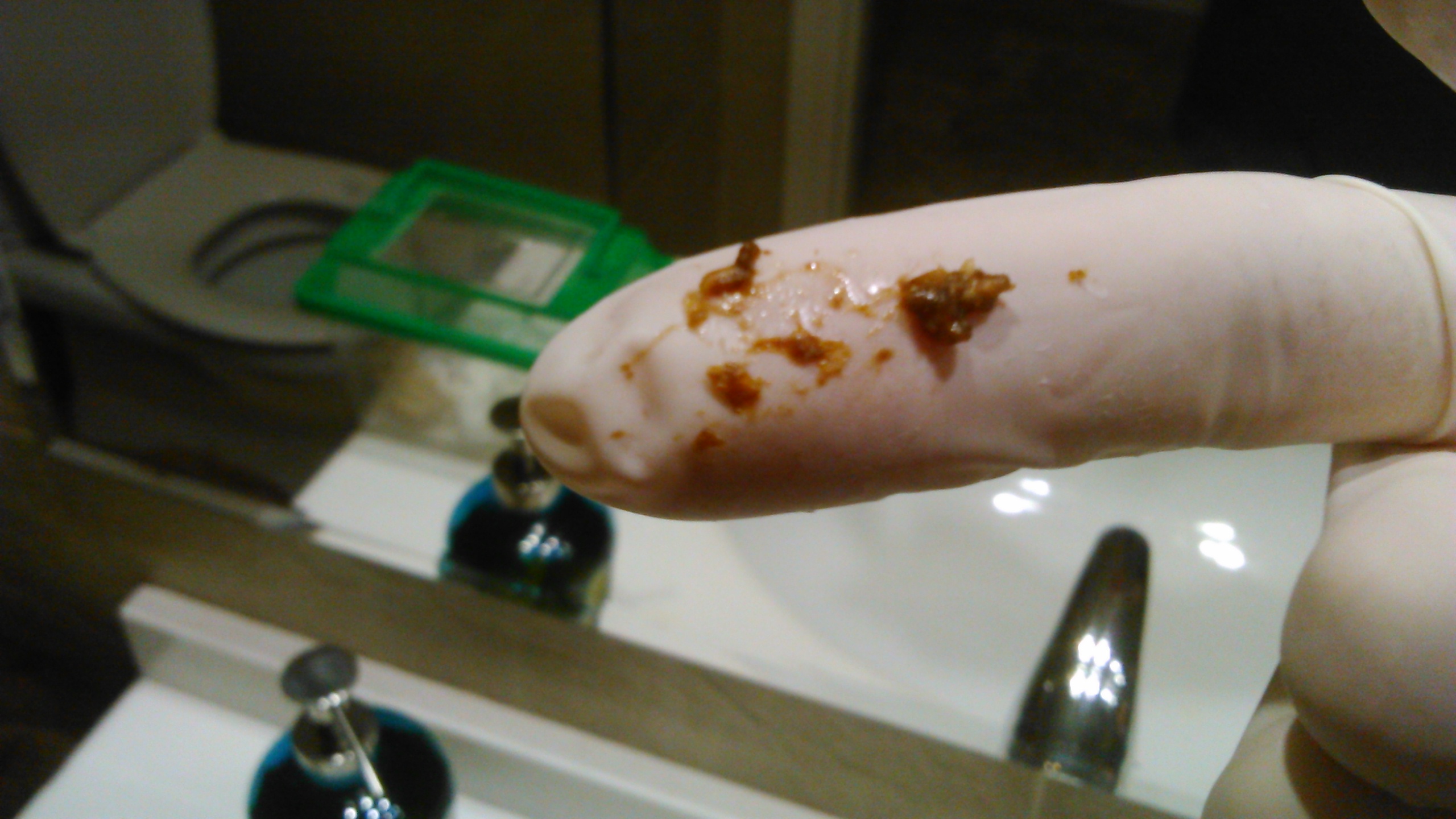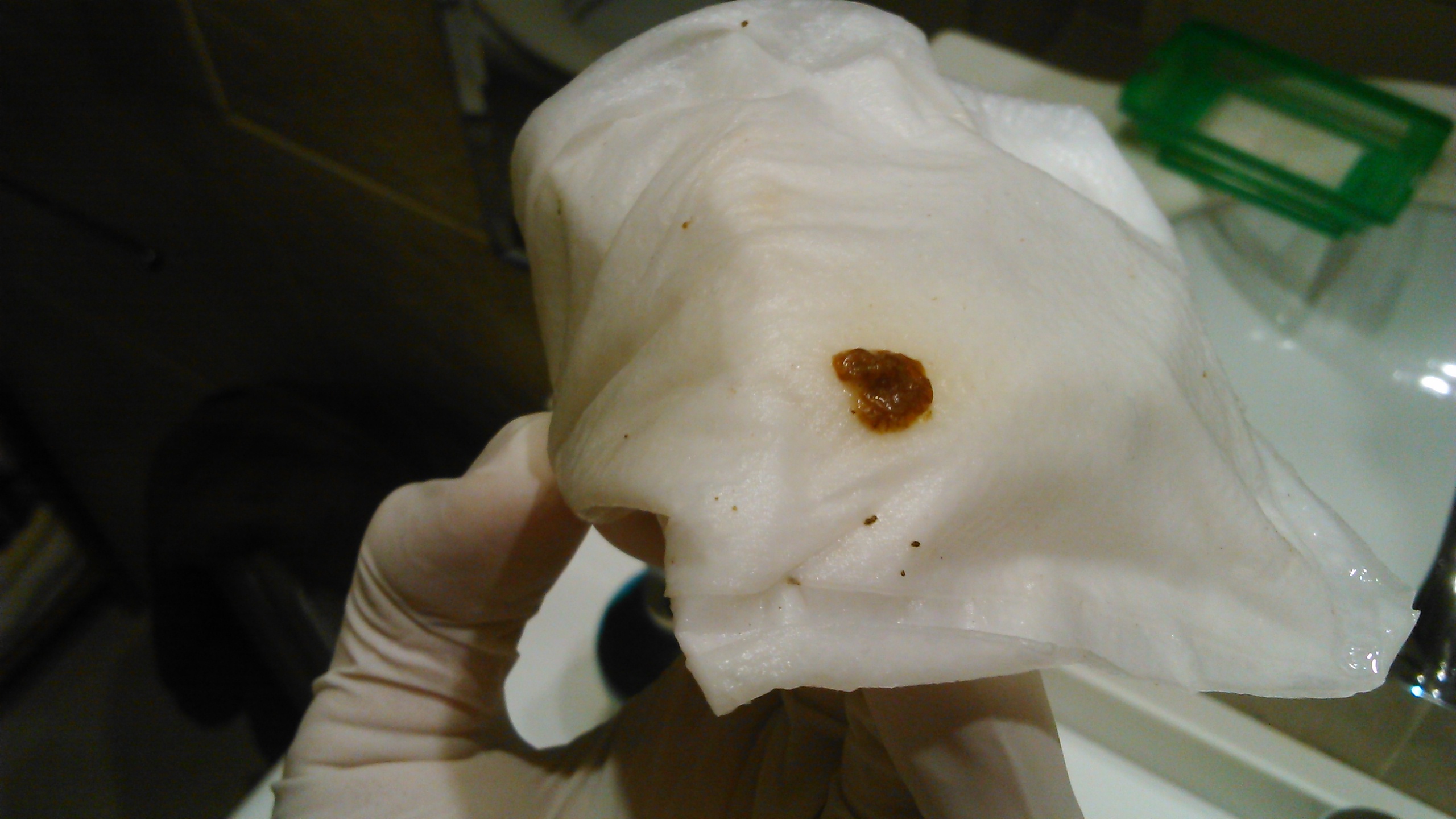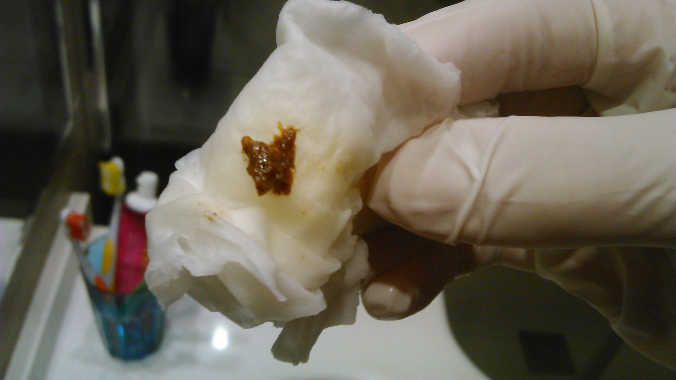 Subo las fotos de los excrementos. Los que salen "descompuestos" ha sido obra mía para que se vea mejor el contenido. Su estado original era el de las fotos en las que salen de una pieza. Siento que la calidad sea terrible pero no tengo otra cámara y la luz no daba más de sí o_O ¿Seguro que son parásitos? La rana no tiene ningún síntoma de debilidad, tiene la piel limpia, está bien de peso, no toma colores raros...