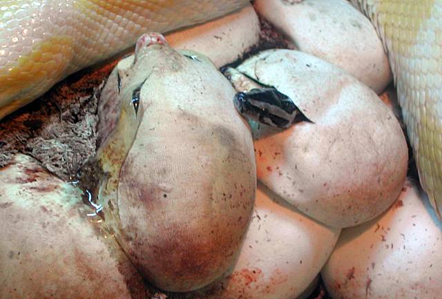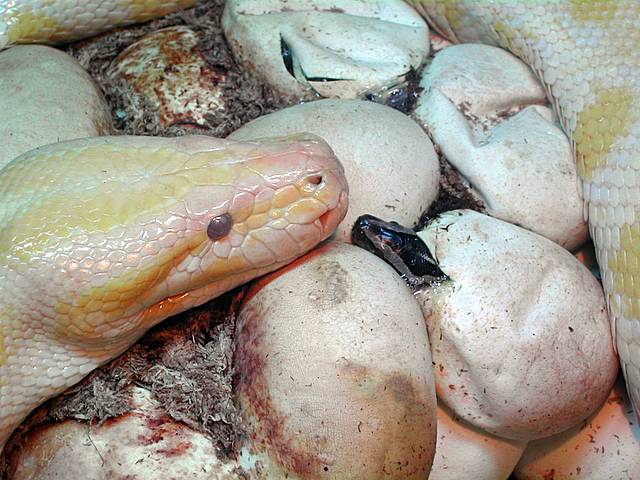 ;) ;) :rolleyes: :rolleyes: jajajajaja!!!!! Estoy que salto de alegría. Esta mañana a primera hora han empezado a eclosionar los huevos de la puesta de mi molurus. La verdad es que e leído bastante sobre que hacer pero estoy tan emocionado que no puedo ni pensar. Es la primera foto que e hecho, pero al cabo de un rato de hacerla la madre a tenido un movimiento brusco y se a vuelto a meter en el huevo