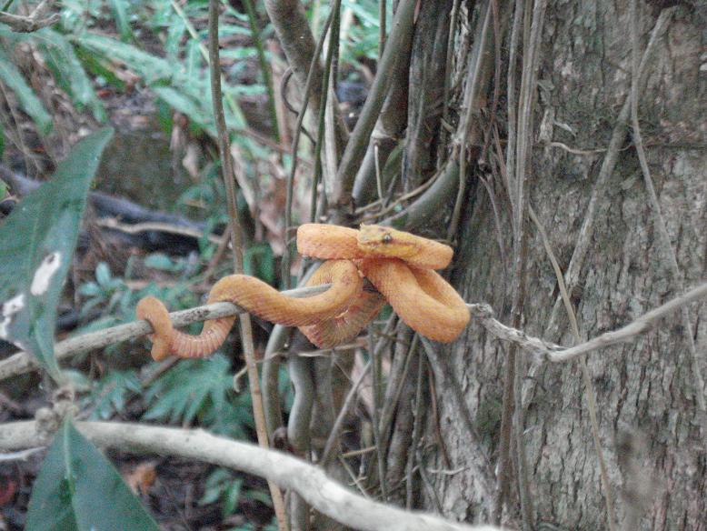 pues si la foto esta hecha por mi,bueno de hecho tengo mas de esta especie,estas serpientes estan en libertad pero son dificiles de ver y mas en epoca lluviosa que es cuando yo fui,la foto es del parque nacional cahuita,es muy bonito de ver todo costarica,aqui os dejo otra foto de otra oropel de color verde,esta es en cautividad.