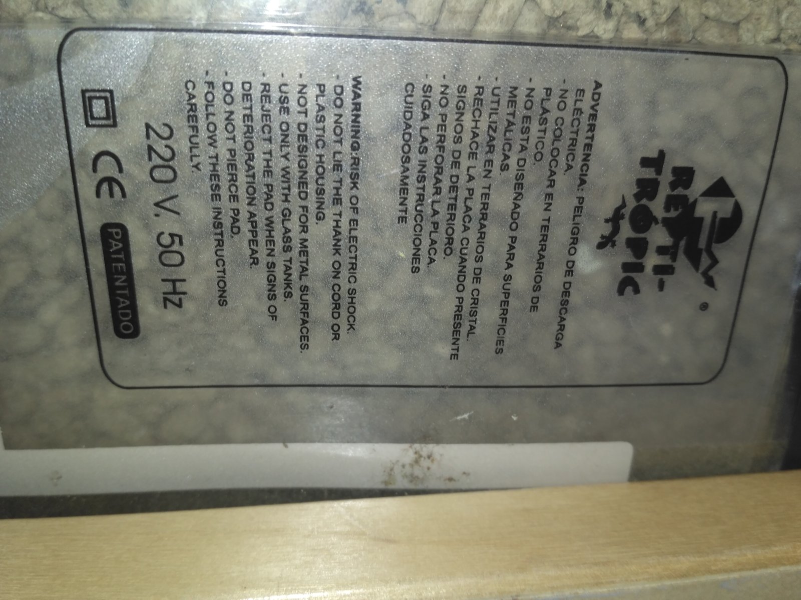 - Placa calefactora repti tropic 220 v de tamaño pequeño. Me la regalaron con el terrario y no estoy seguro de que funcione correctamente, calentar calienta, pero no se si lo que debería, y tampoco estoy seguro de que se note. Está instalada en la parte izquierda del terrario, justo debajo de la casa-nido del tenrec