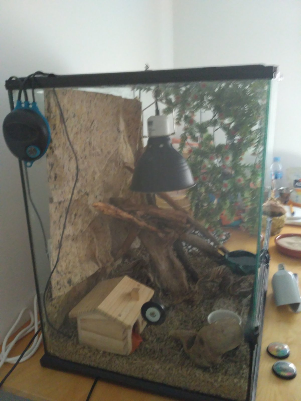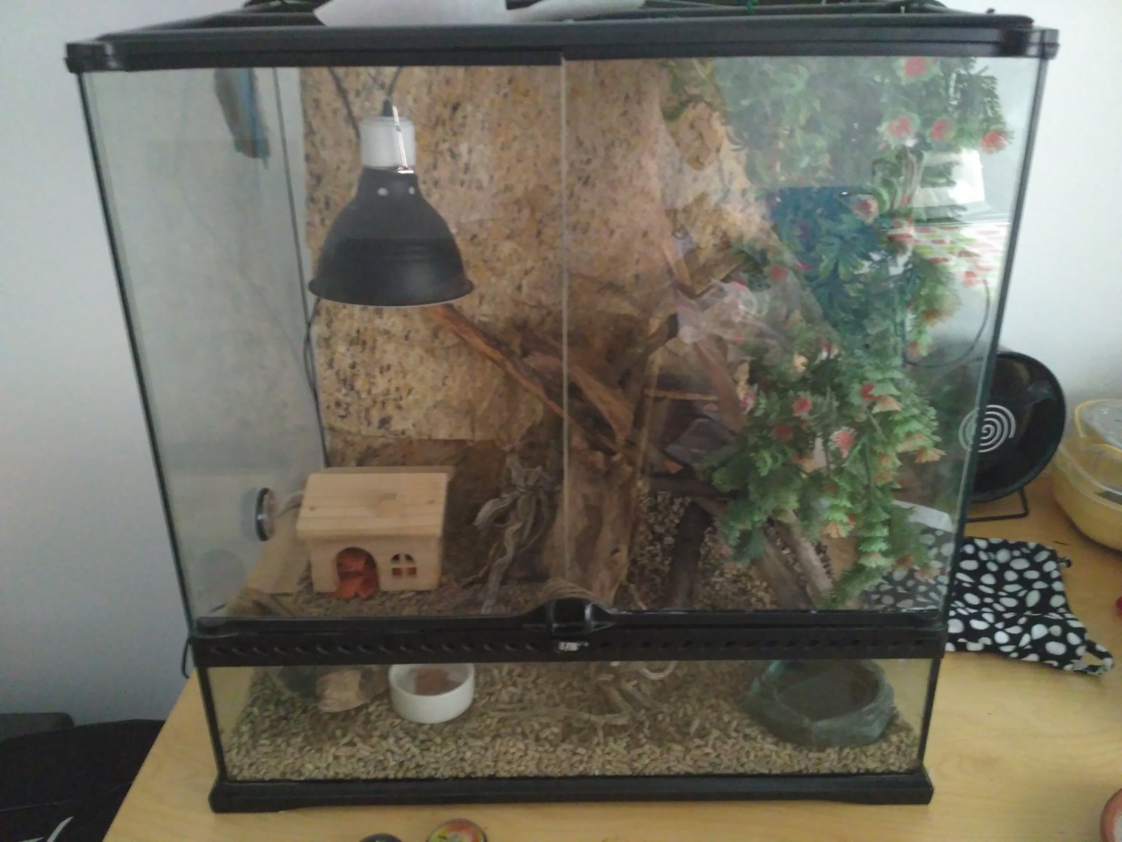 PD: en ese terrario te vendría bien hacerle un segundo piso de madera, agradecerá espacio extra e instintivamente buscará refugio en las alturas, así que no olvides ponerle una casita en el segundo piso!