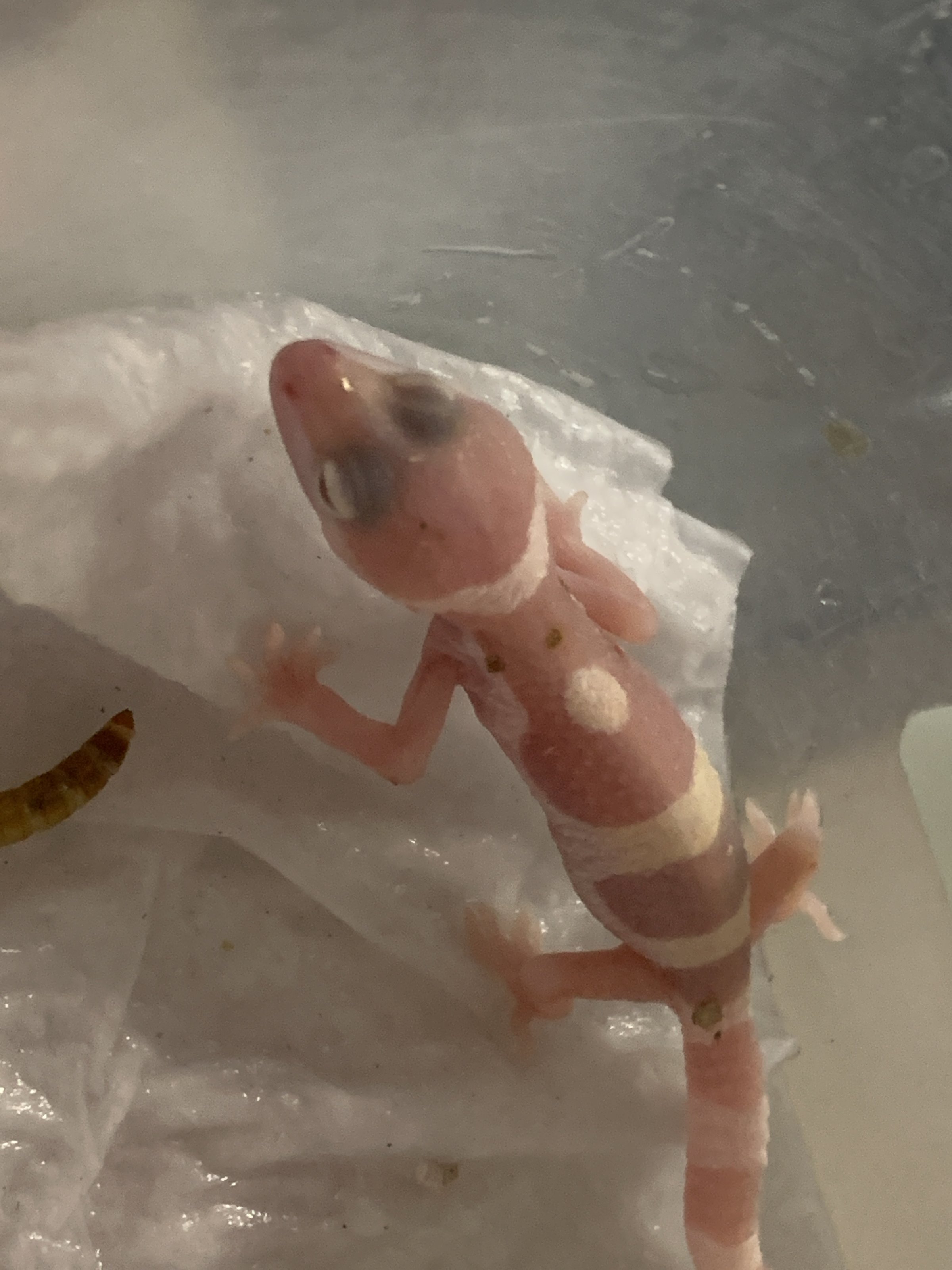 Ese ejemplar parece un gecko leopardo amelanístico (sin melanina o albino). Tal ves no haya abierto los ojos porque está expuesto a mucha luz.