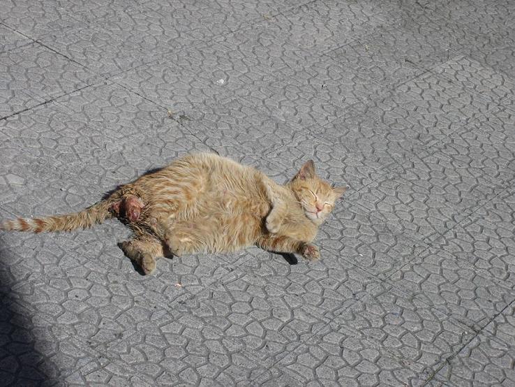 Bueno despues de ver la foto tengo que deciros que, ni está pariendo ni es una gata, ya que no existen gatas de ese color, es un color ligado al sexo y todos los gatos rubios son machos, igual que los tricolores son hembras, Así que me temo que es el resultado de un atropello y lo que asoma es parte del intestino del pobre animal. Lo siento pero ojalá estuviera pariendo de verdad, lo mejor es que si puedes lo lleves a un veterinario. :'(.