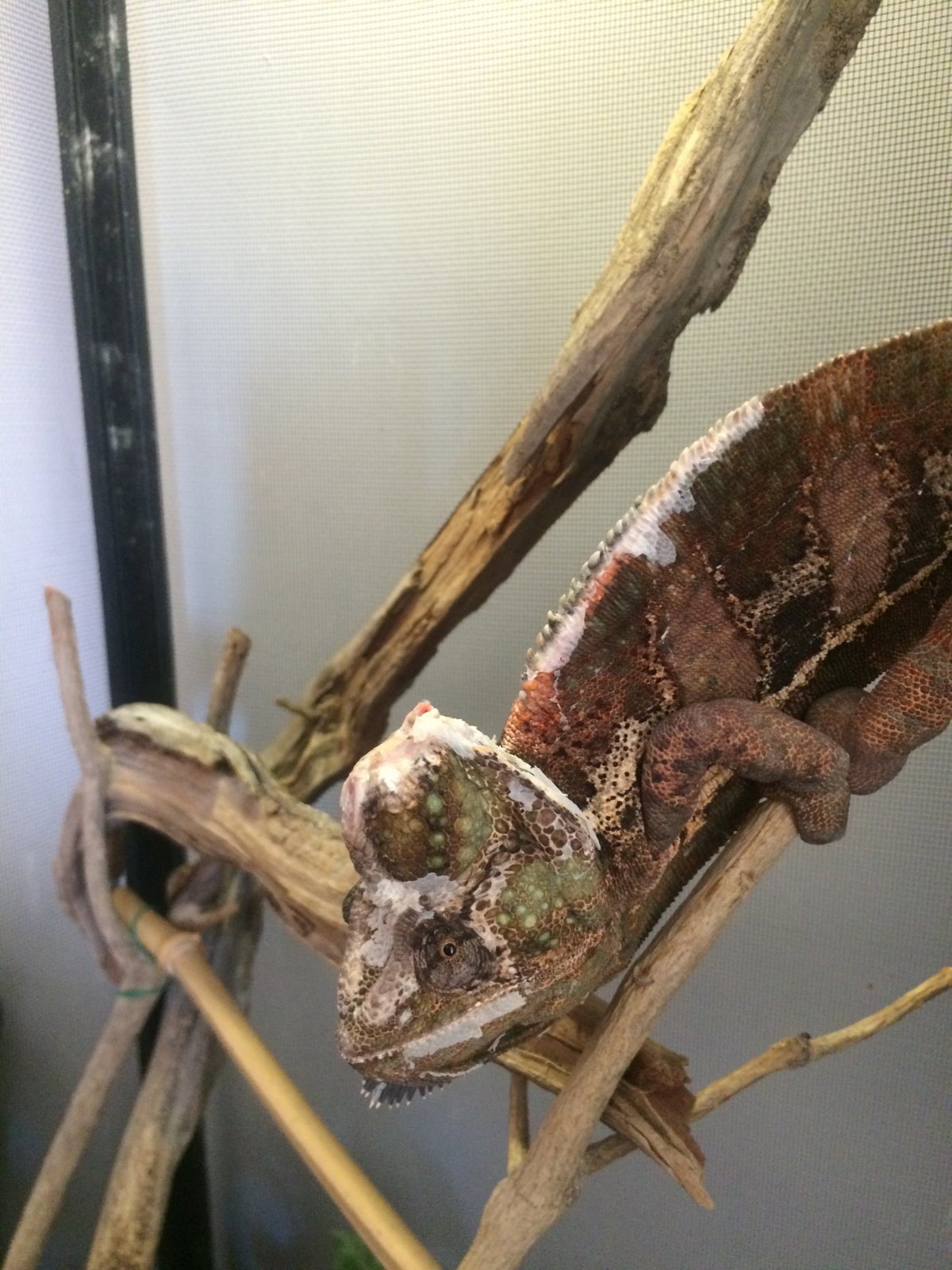 Estoy contigo mejor que lo lleve al veterinario antes de nada, lo que no entiendo es como no lo ha llevado aun, es decir, yo veo que pierde parte de la cresta y corriendo al veterinario.(sin animo de atacar a nadie)Supuestamente esas vitaminas si que tienen calcio, asi que el problema deberia de venir de antes... Hace cuanto tienes al camaleon? Le das esas vitaminas desde el principio? Aun asi, en ese terrario le falta humedad, ponle plantas naturales y echale agua con un spray un par de veces al dia, sobre todo necesitas aumentar la humedad ahora que esta mudando. Leete alguna ficha de estos camaleones para saber como mantenerlos a la perfeccion.