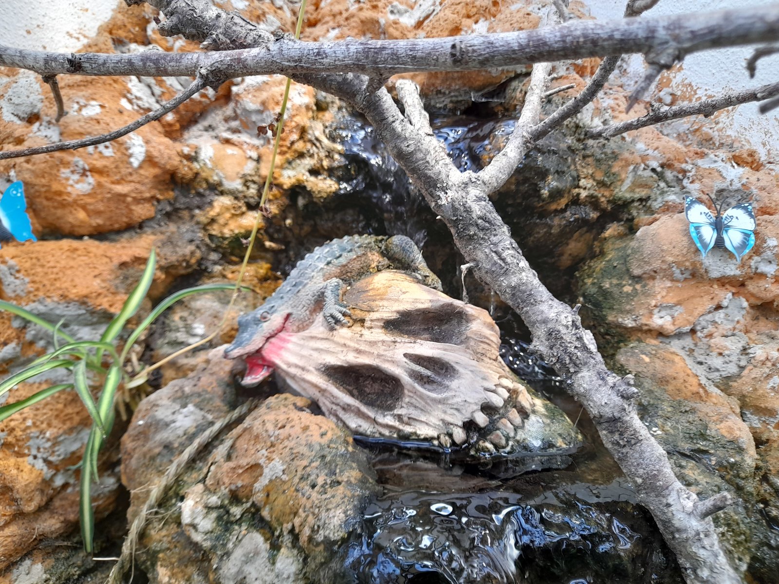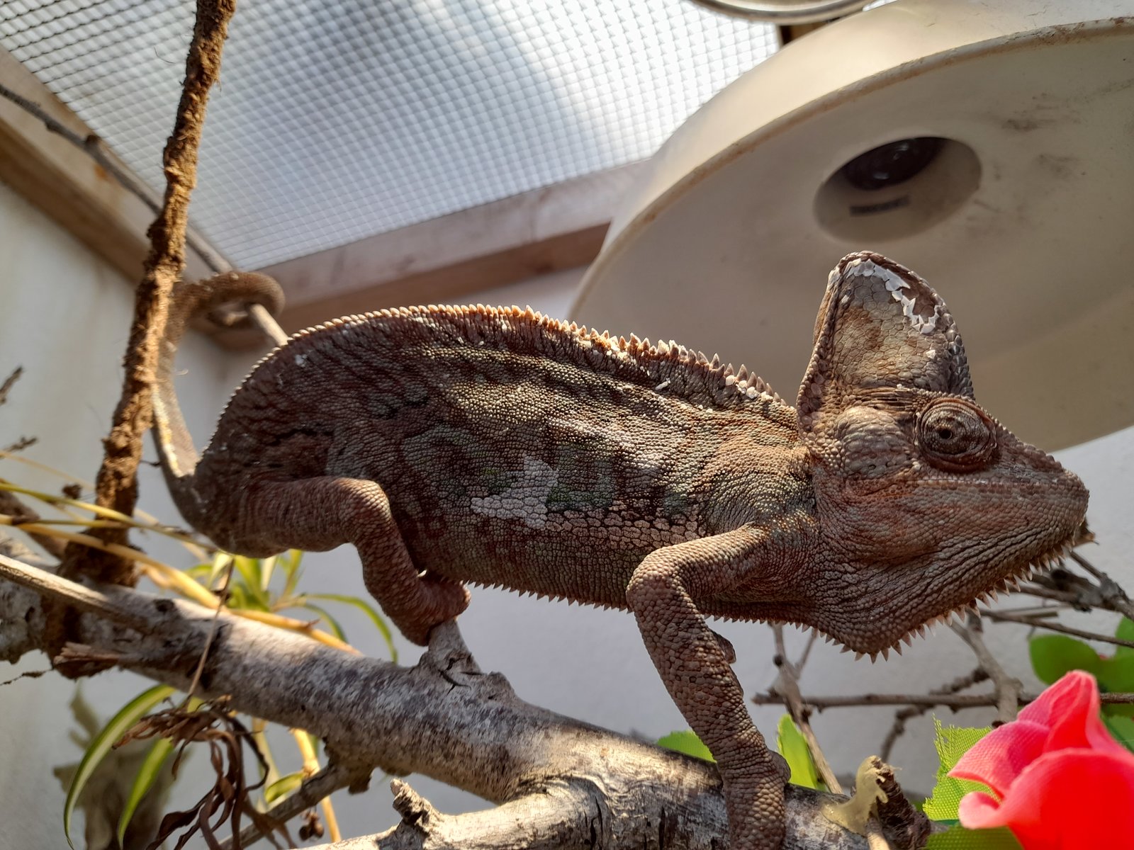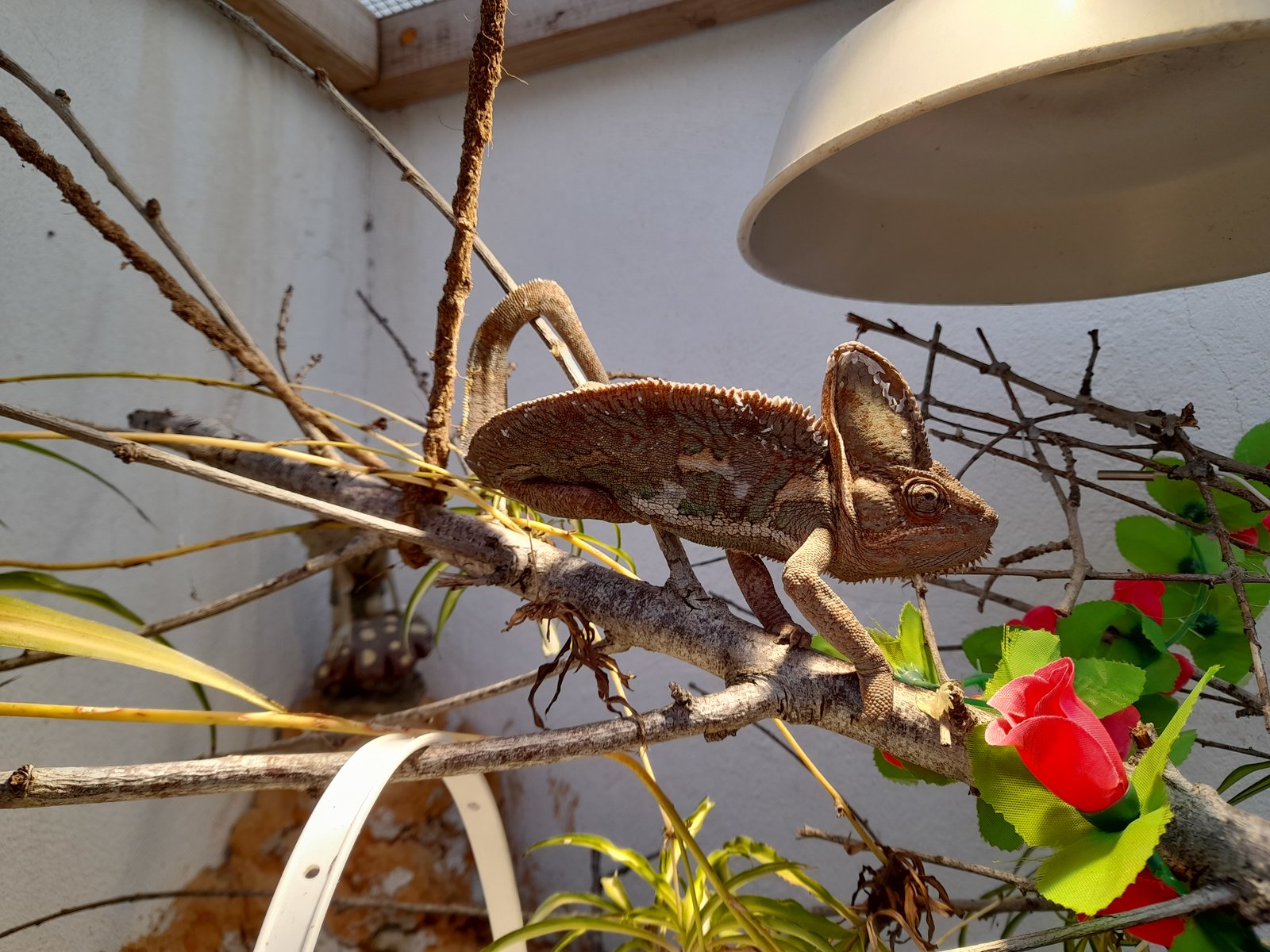 Respecto a meter otro animal con el Calyptratus, la respuesta es muy clara = NO, los camaleones en general son reptiles muy territoriales y no toleran bien el compartir territorio. Seguramente se peleen o acabe mal el tema. Si quieres introducir otro animal, mejor que pongas una separación sin visibilidad en el recinto.