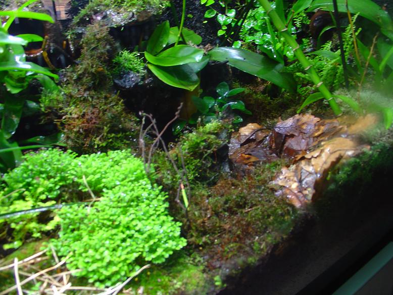 Este es el vivario donde van 200x70x70 si veis que no esta muy nitido es porque estaba funcionando el agua de lluvia humedad 80% al 100% el suelo tiene musgo y algo de hoja de roble puedo poner mas y hay dos charcos para bañarse.