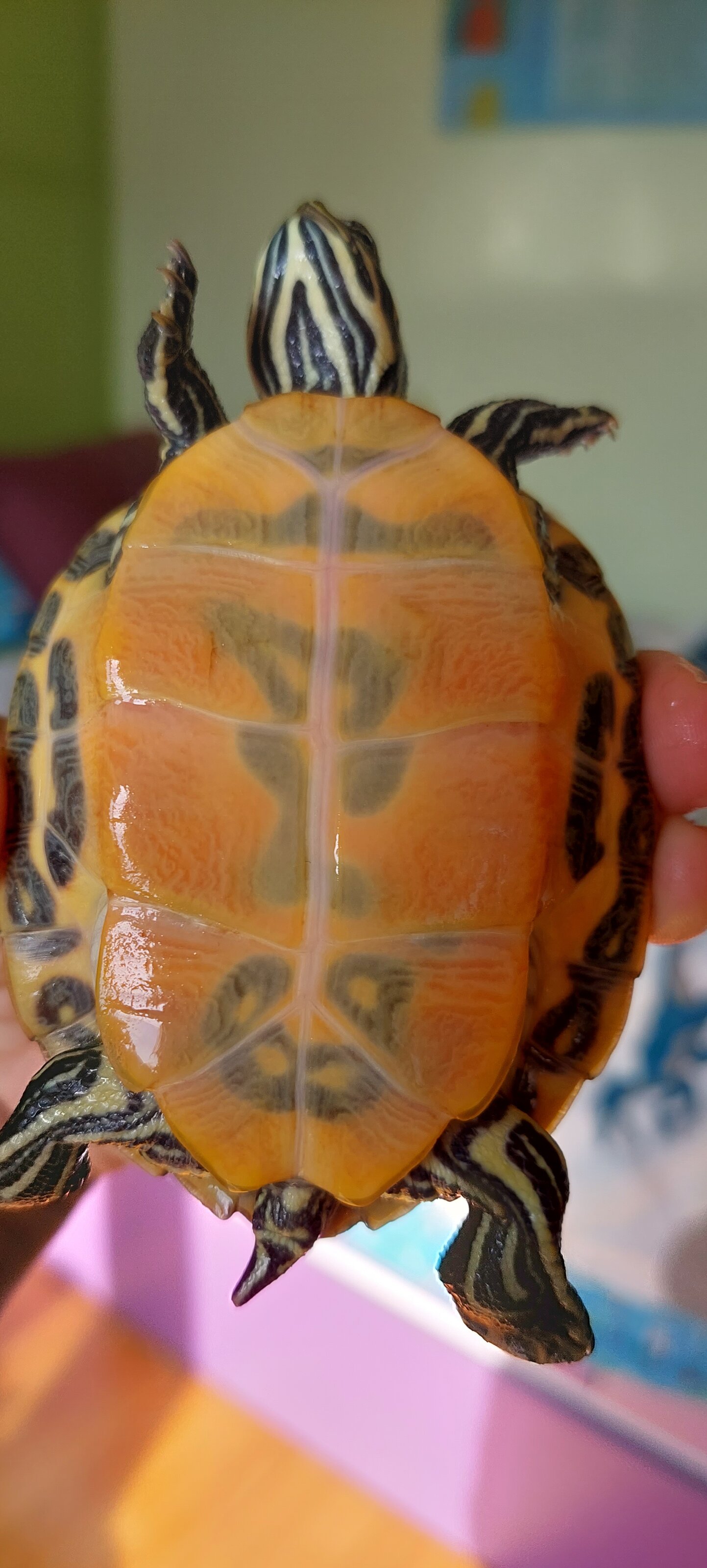 Hola! Dejé a ni tortuga al cuidado de otra persona mientras me fui de viaje y al volver a casa he botado que el plastrón ( caparazón por la parte de la barriguita) le había cambiado el color.En realidad es como si se hubiese decolorado con lejía.Está muy clarita y antes era mas oscura.A qué se puede deber? Por lo demás esta bien.Gracias
