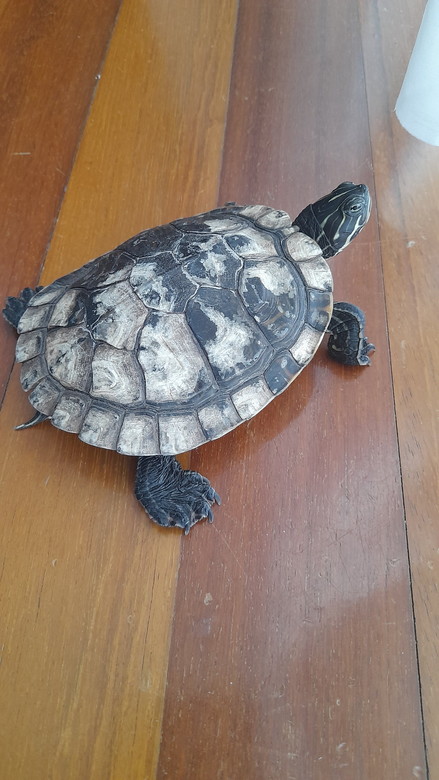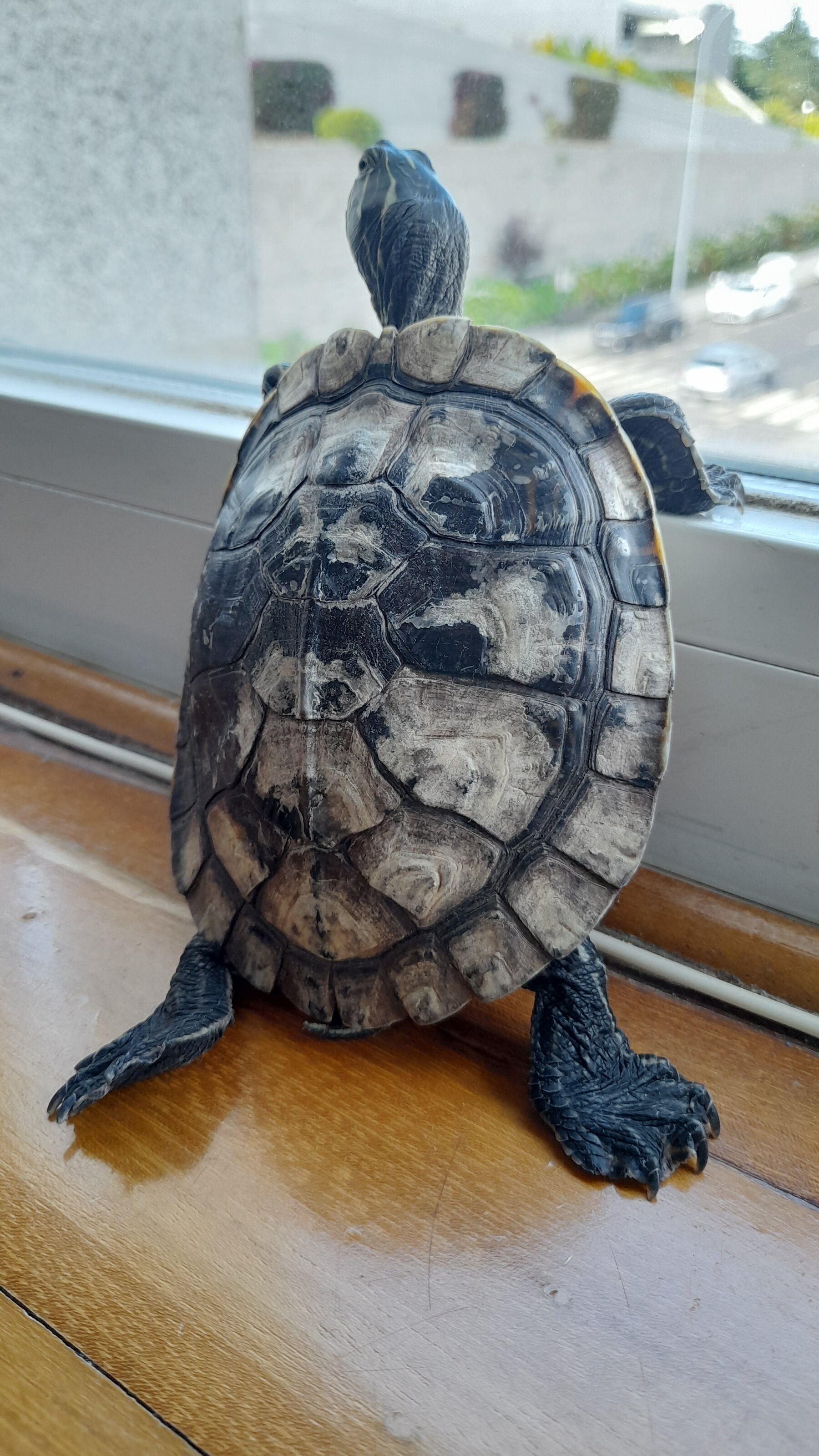 Esta es Compa. Una tortuga acuática a la que no le gusta el agua. Sólo entra para comer pero en seguida empieza a hacer ruidos y a escalar para que la saquemos...luego camina por casa hasta que se cansa. No sé qué le pasa en su caparazón, siempre lo ha tenido muy feo. Lleva con nosotros 3 años y donde vivo no hay veterinarios expertos en tortugas. ¿Podría alguien decirme qué pasa y cómo solucionarlo? Come pienso siempre aunque a veces come lechuga, zanahoria, gamba cruda o pollo. Gracias