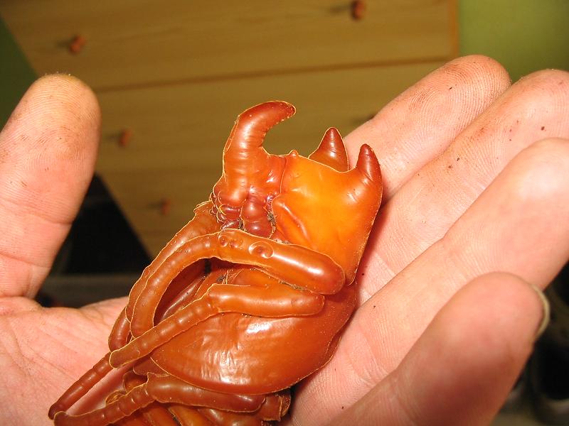 En la segunda foto se puede apreciar como los cuernos no se han desarroyado del todo en la pupa. Pero aun asi creo q sera un ejemplar impresionante