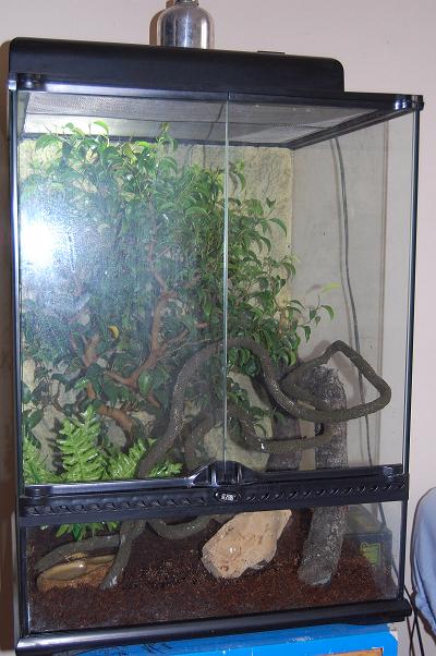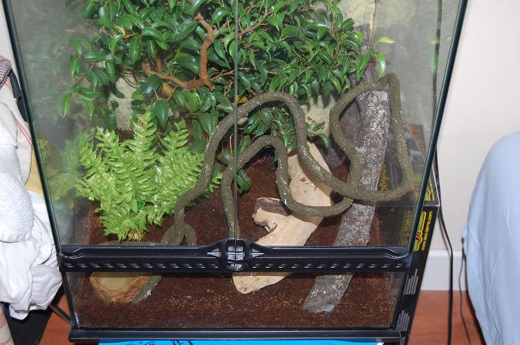 Buenas, he cambiado hoy la decoración del terrario de mi pequeña ciliatus (7meses). A ver si me podeis dar algún consejo para ponerlo bien, he metido una liana, un ficus, un 3 troncos, una planta artificial y el bebedero, pero no estoy muy seguro de que tenga espacio suficiente. espero vuestras respuestas. un saludo