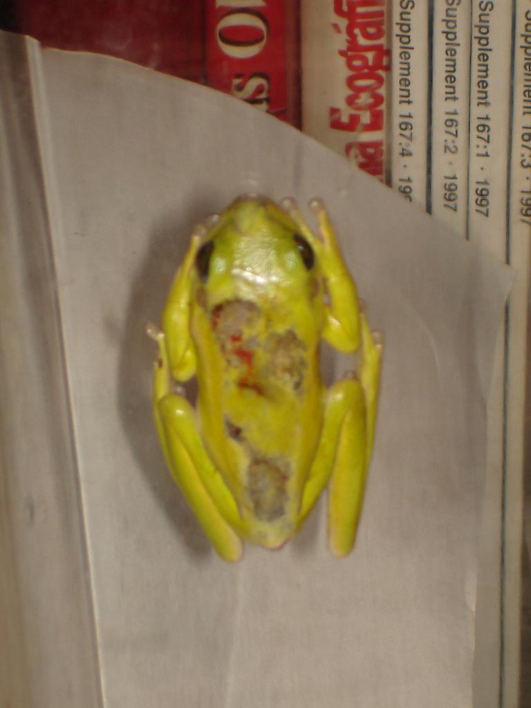 Os dejo una fotos de una de la hylas cinereas que tengo que me la he encontrado con este lamentable aspecto. La acabo de separar del resto pero ya se lo que le espera desgraciadamente. Ya hacia dias que la veia un poco rara.
