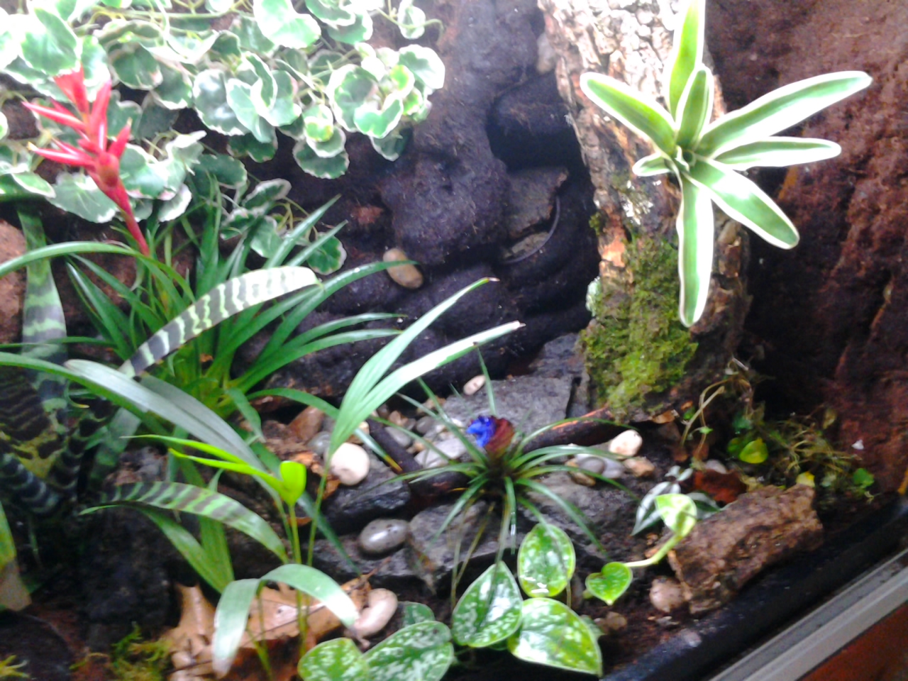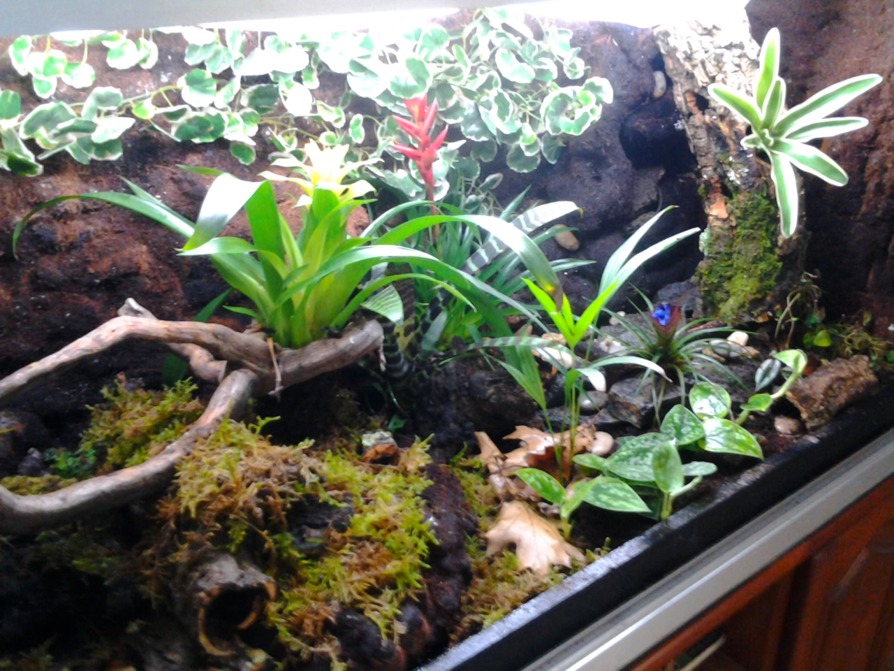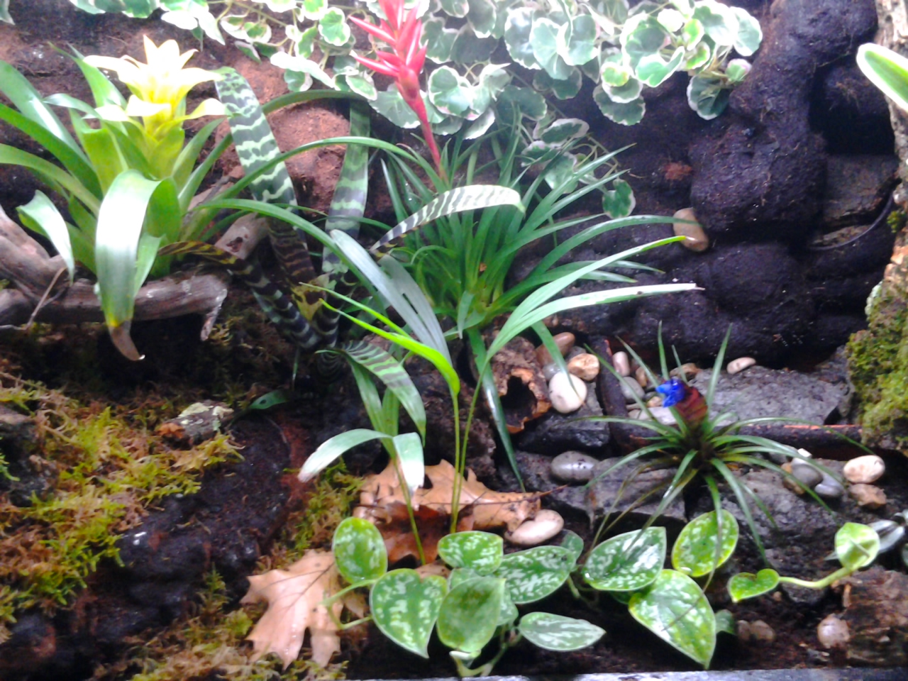 Cuando pongas más bromelias quedará muy guapo, algo así quiero hacer yo en el terrario grande, pero con un tronco grande y ramas también anchas, simulando un arbol.