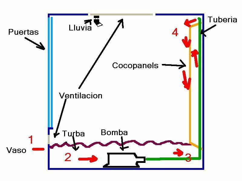4 el agua sube por las tuberías...hasta la parte mas superior, allí por unos pequeños orificios, sale el agua, empapando los cocopanels..., y el agua por su peso, vuelve a caer al "suelo", volviendo a ser impulsada hacia arriba...así se forma el circuito.