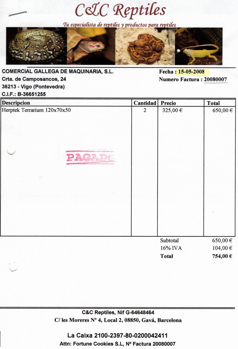Con fecha 15 de Mayo de este año le he comprado 2 terrarios Herptek, curiosamente el titular de la factura no se corresponde con la empresa que recibe el ingreso (fijaos los datos del final).