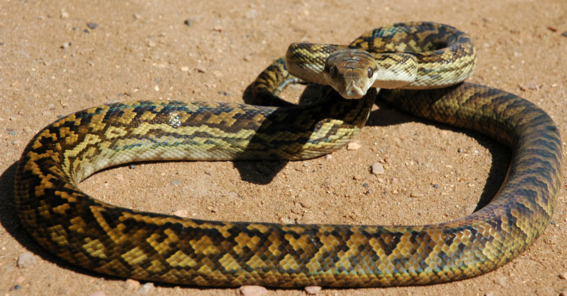 Yo tenía una imagen en el ordenador de un tipo de serpiente como éstas (disculpad mi ignorancia hacia esta especie) con un color entre plateado y amarronado comiéndose un cerdo bastante grande en un fondo rocoso semejante a El Colorado de USA.
