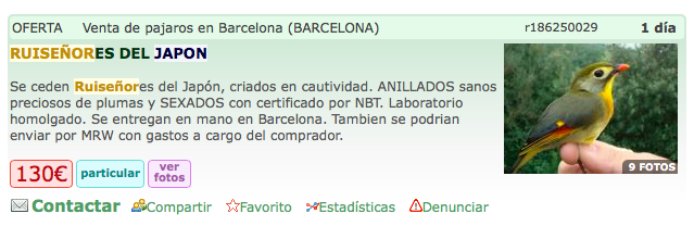 De todas formas, seguro que hay algo que se nos escapa. Verás, el ruiseñor del japón está catalogada como especie invasora, y por BOE prohibida. Pero se venden "criados en cautividad", "anillados", "sexados" y con certificado "NBT". Es decir, con todo esto NO está prohibido tenerlos. ¿Tengo razón?