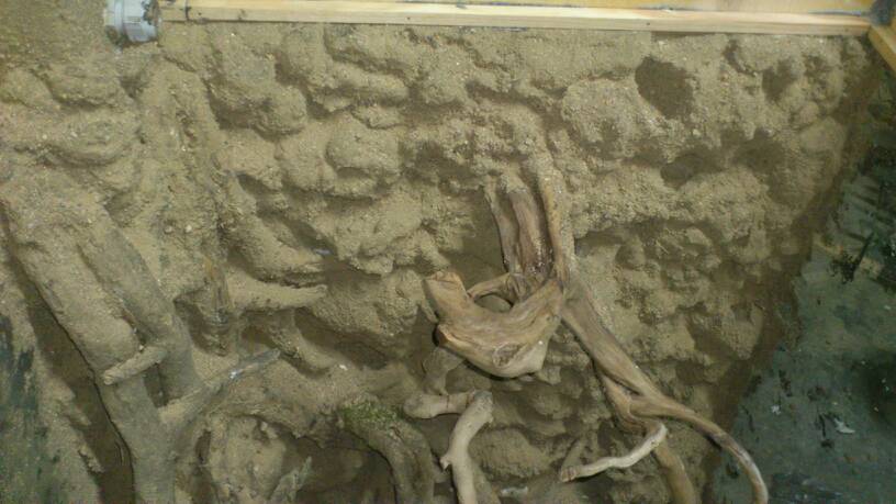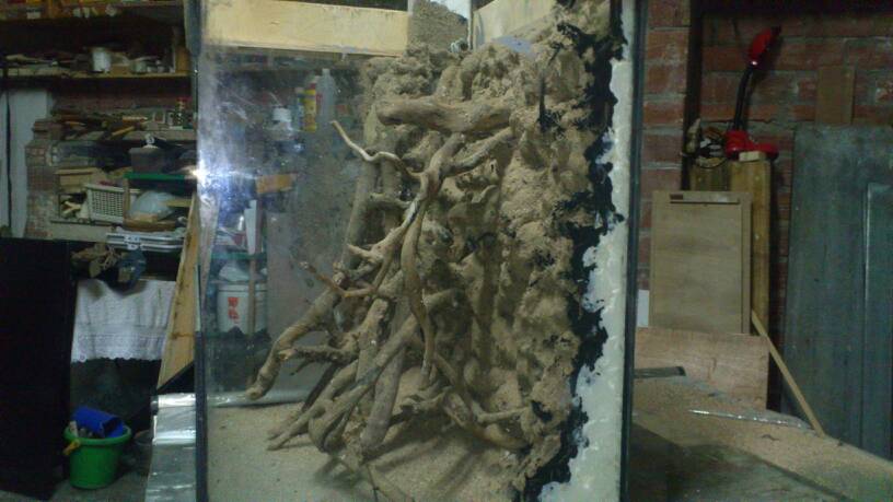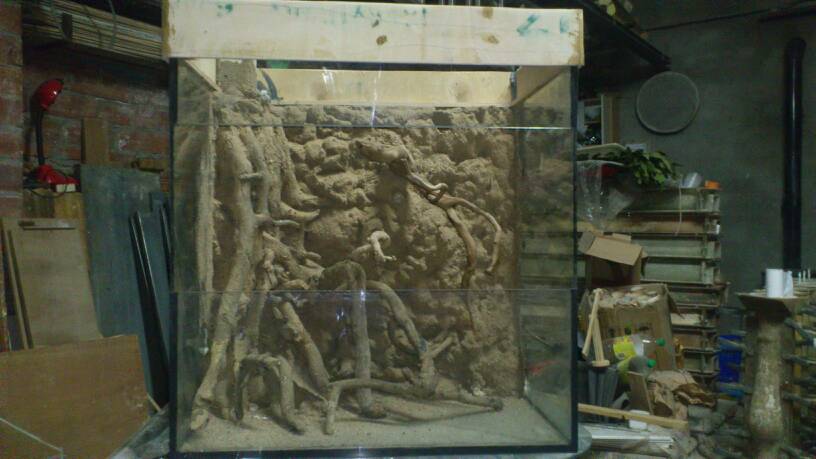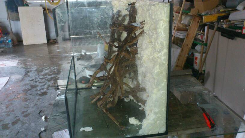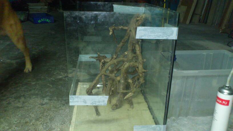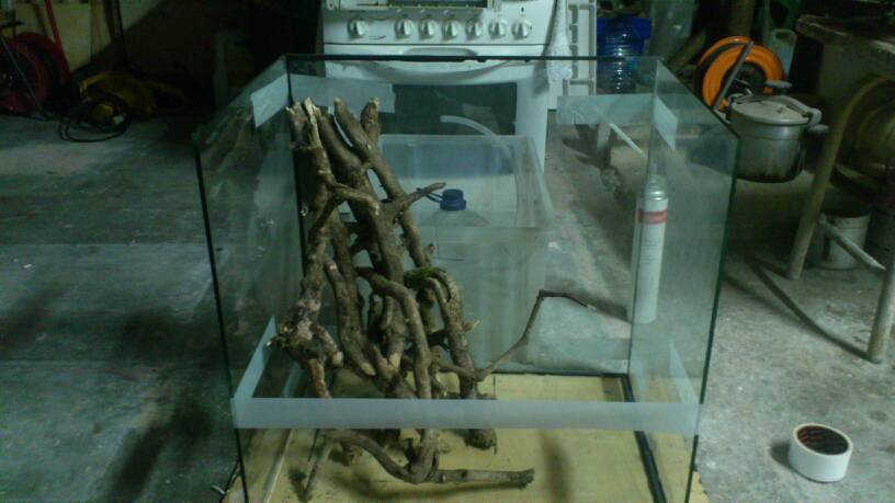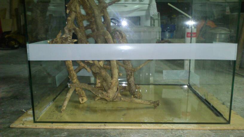 Aquí no se para! Ya he empezado el otro terrario, este será de 60x60x45cm, ya tengo casi todos los cristales cortados y si mañana puedo lo empiezo a pegar. La verdad es que como era solo de 60cm de alto no me esperaba que se viera tan grande pero al tener 45cm de ancho se ve bastante más grande de lo que esperaba. Dejo algunas fotos para que podáis ver la idea. El agua llegará hasta la parte de arriba de la cinta blanca, son 25cm y hay irán unas gambas. Los aparatos del terrario irán escondidos en un tubo de pvc que irá en la esquina entre las raíces. Una duda que aún me queda es como poner las puertas, mi idea es poner dos puertas de hoja, las puertas de corredera no me han acabado de convencer en el terrario grande y por eso quería provar con eso, que os parece?