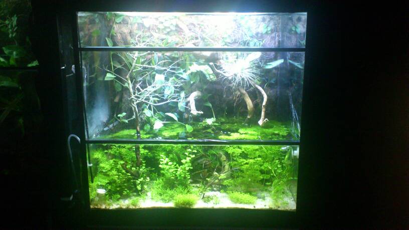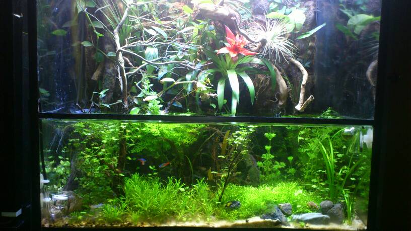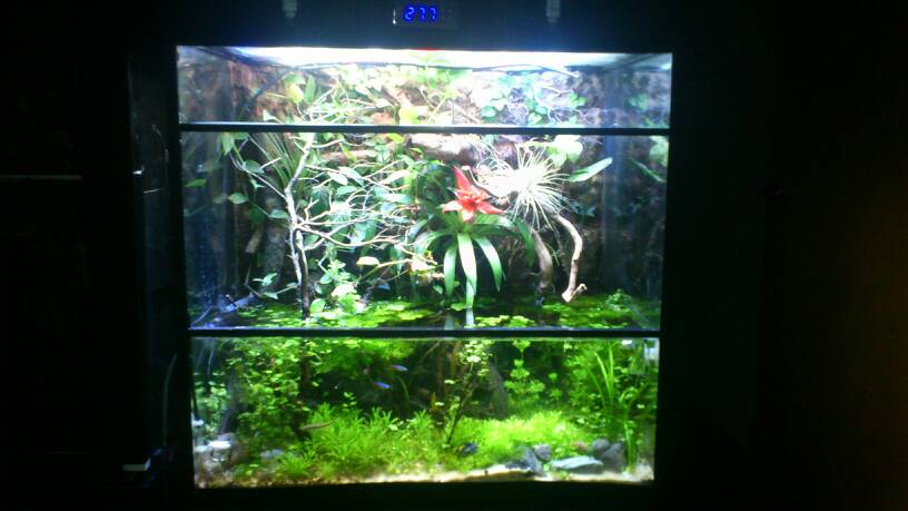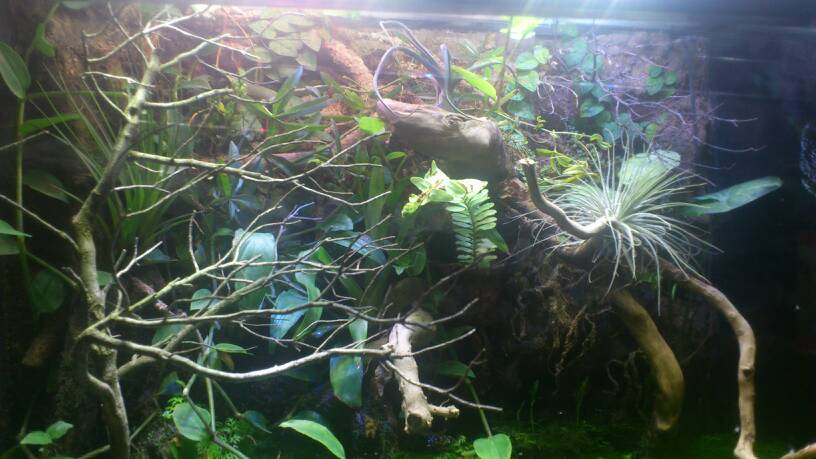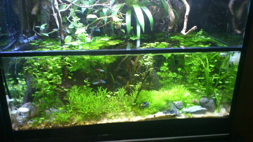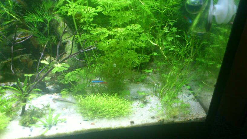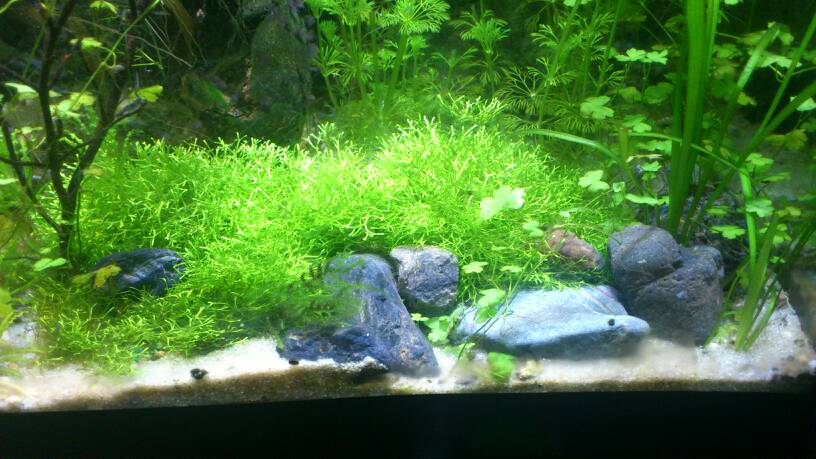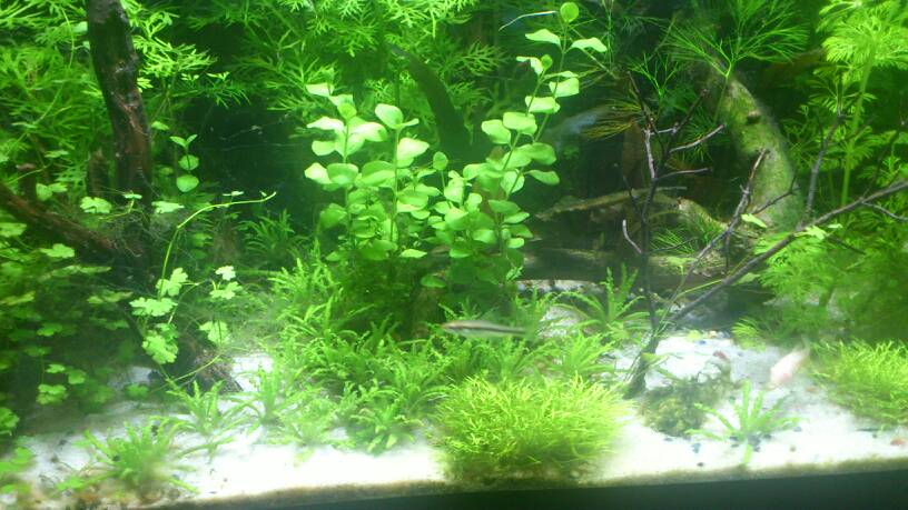 Actualizo un poco como va este proyecto, la verdad es que estoy muy contento con la pantalla de Led, las plantas han respondido muy bien y el verde es alucinante. El crecimiento es bastante bueno aunque todavía no abono con macros, esta semana me llegan las sales. He tenido algunos problemas con las algas marrones y negras, eso ya está solucionado casi al cien por cien pero para luchar contra ellas decidí meter unas plantas que tenia en el gamberio y me han pasado la dichosa cladophora, no crece verde, solo como unos hilos blancos pero ya llevo un par de semanas y me estoy cansando. Espero que os guste el aspecto natural que va cojiendo todo el conjunto, a la que se estabilice el tema de las algas tengo que retirar algunas plantas y le cambiaré algo la decoración.
