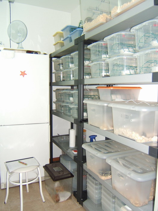 En las estanterías están dispuesto todos los tupper plásticos donde mantengo a los neonatos y juveniles, una instalación sencilla y muy higiénica, quizás estéticamente no la más apetecible, pero en este caso con las crías opino que debe primar lo más práctico. Estos tupper tienen de sustrato papel blanco de cocina para los neonatos, que luego sustituyo por viruta de madera cuando están algo más creciditos, les dispongo un recipiente para el agua de plástico blanco y redondo, y según para que especies, les instalo unas perchas de malla plástica o tubo de PVC.