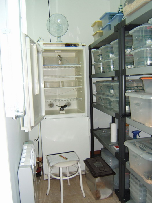 Se aprecia la incubadora preparada a partir de una nevera averiada, la cual ya ha sido empleada con éxito esta temporada. Para su construcción eliminé todo el sistema de motor y refrigeración de la nevera, dejando tan sólo la estructura, que sirve estupendamente bien como incubadora, ofreciendo un aislamiento excelente, y una cómoda distribución vertical por medio de las baldas originales. En su parte inferior instalé un pequeño ventilador de un calefactor de uso doméstico, permite distribuir el aire caliente de una forma uniforme por todo el volumen interior de la incubadora, así como la humedad ambiental. A los lados del citado ventilador están dispuestas dos bombillas de 60 W cada una, constituyen el elemento calefactor de la incubadora, y está regulado su encendido/apagado por un termostato con sonda, situado en la parte superior y exterior a la nevera. La sonda del termostato penetra por la parte superior de la incubadora y se introduce en el tupper plástico donde se colocan los huevos a incubar, depositados sobre vermiculita humedecida. En la parte inferior, en la balda situada encima de los focos calefactores, se disponen dos recipientes llenos de agua, la cual por medio de su evaporación eleva la humedad ambiental en el interior de la incubadora, así como nos sirven como masa de inercia térmica permitiendo recuperar mucho más rápido la temperatura ambiental después de abrir y cerrar de nuevo la incubadora.